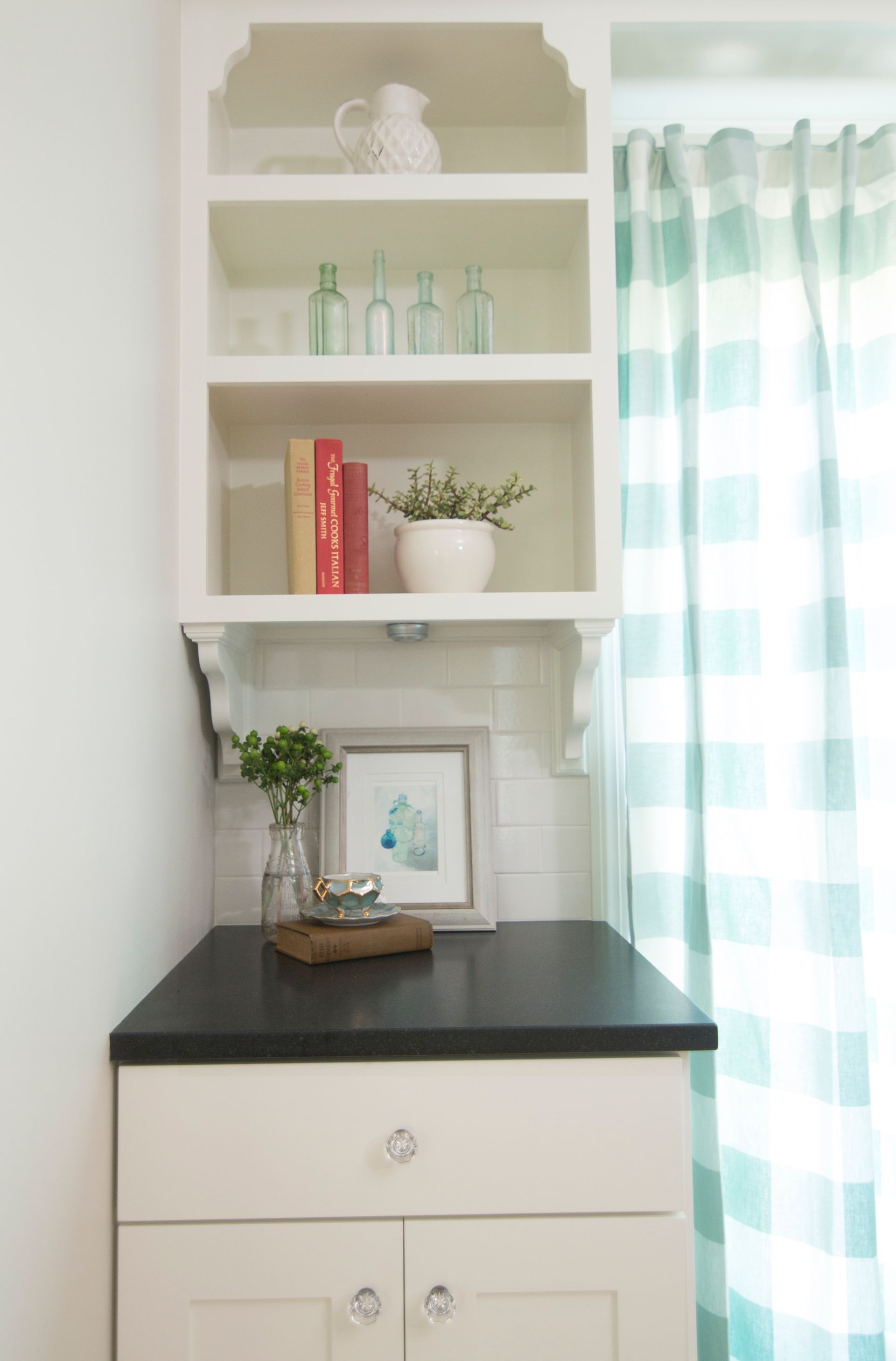 A range hood blends seamlessly with the cabinetry replacing the microwave which was given a new home in a cabinet beside refrigerator. Finally, we love addition of the sweet corbels below all the upper cabinets.