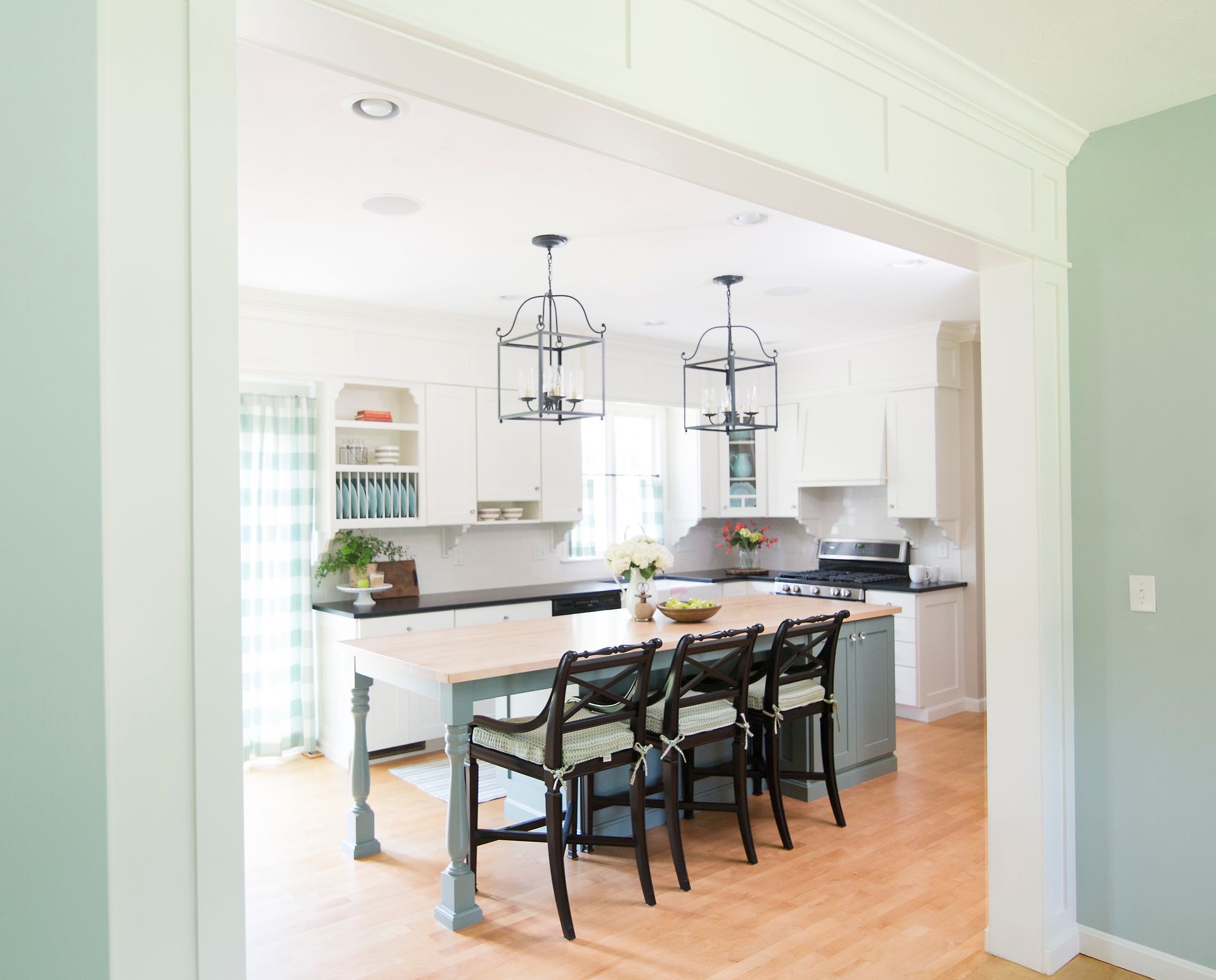 Our carpenter’s work can be seen throughout this room. In order to give the homeowner some more space in the kitchen, an additional cabinet was added which features open shelving and a plate rack and closed storage below. The island was extended, widened and given a new façade to add to the character of the space. Every farmhouse kitchen needs a farmhouse sink so our carpenter repurposed the cabinet to to allow for the sink.