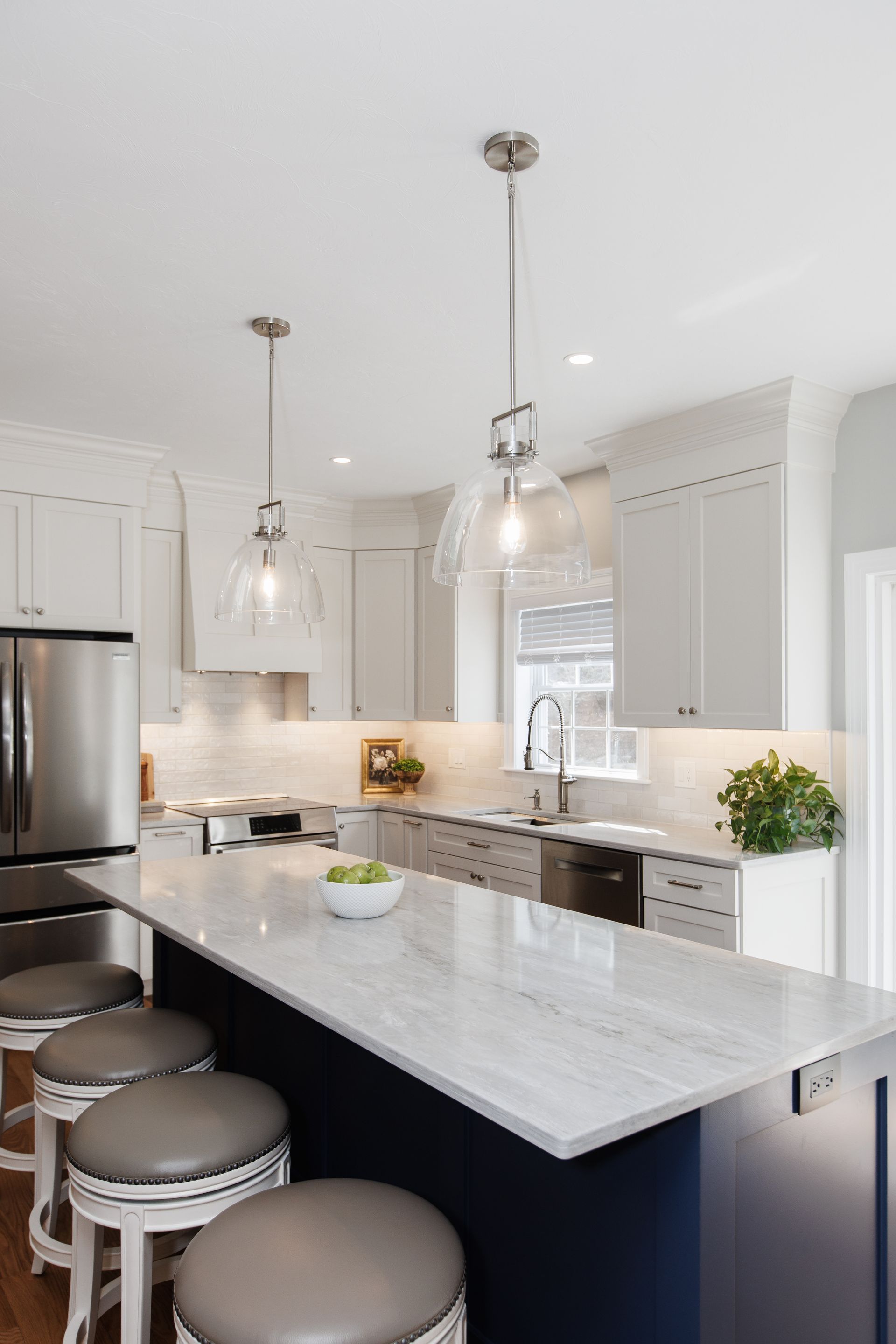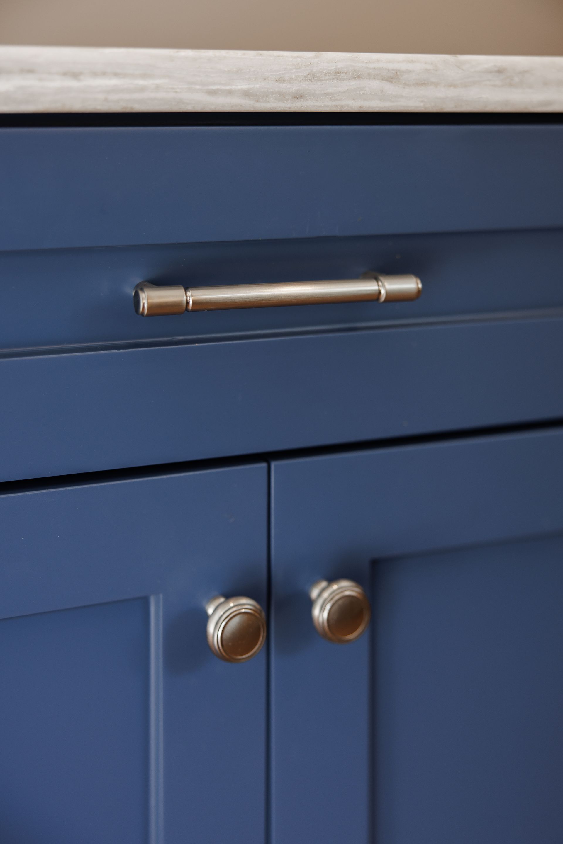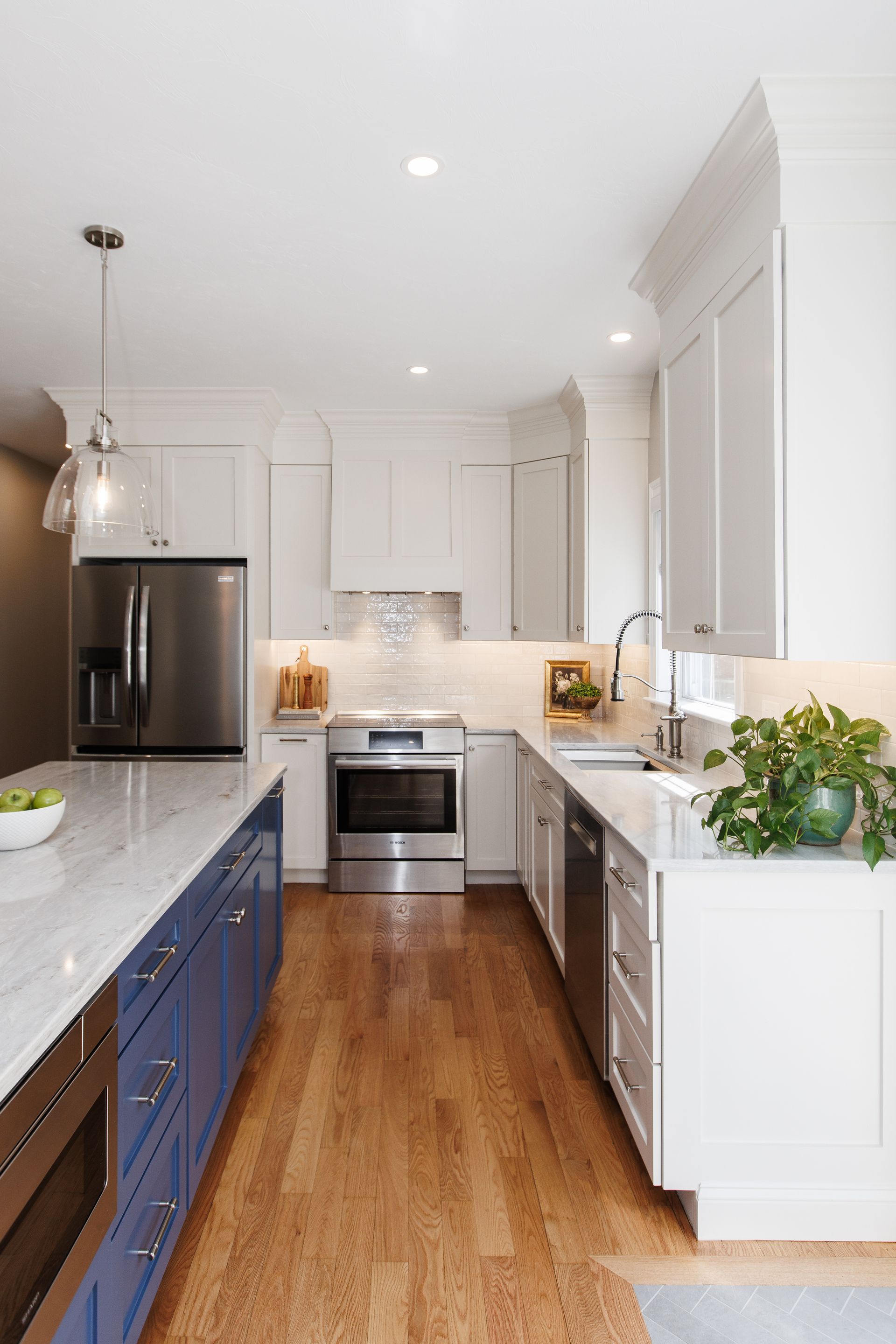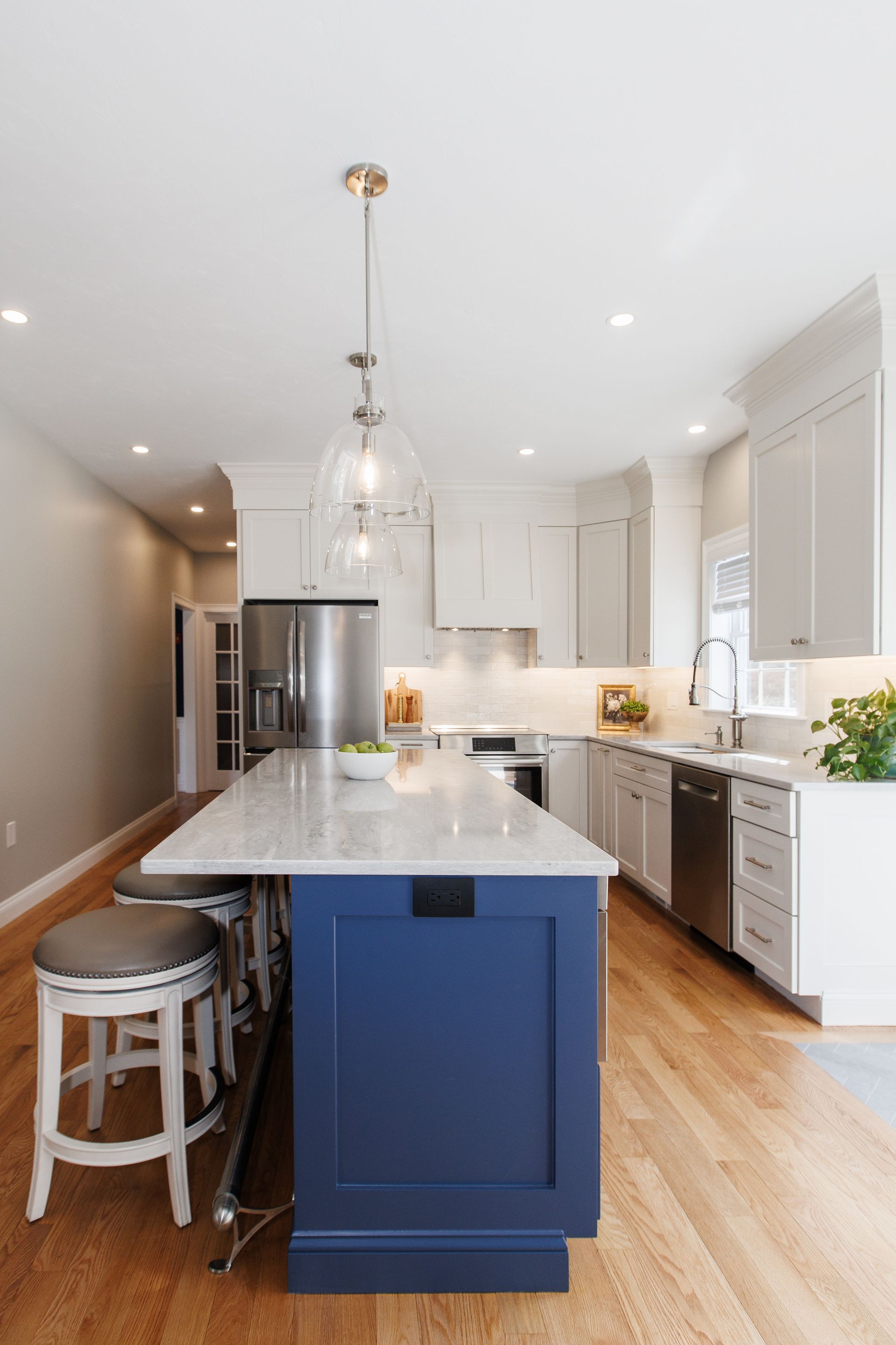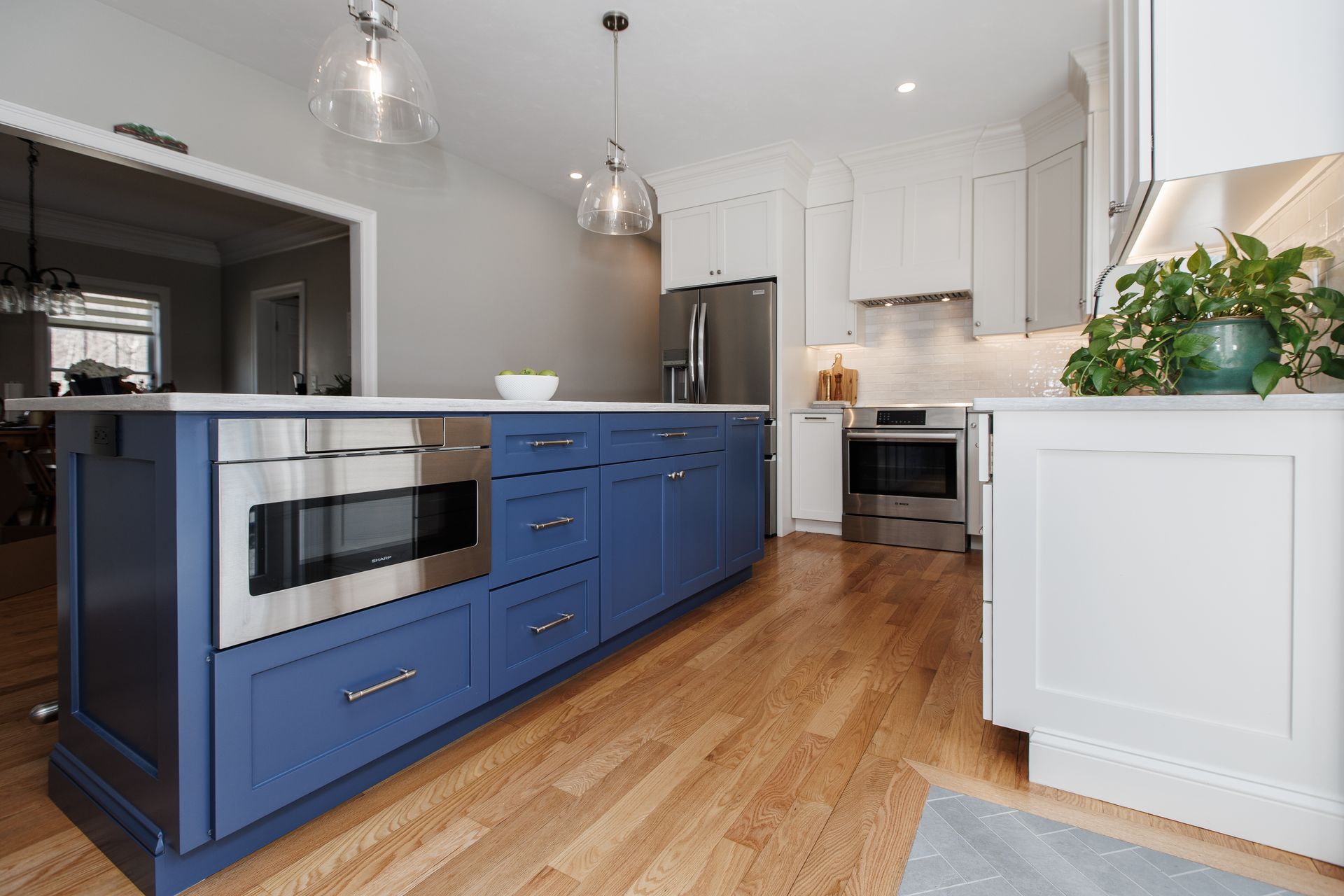 - A brand-new custom-built island, painted in Benjamin Moore Kensington Blue, designed to better fit the space and increase functionality.