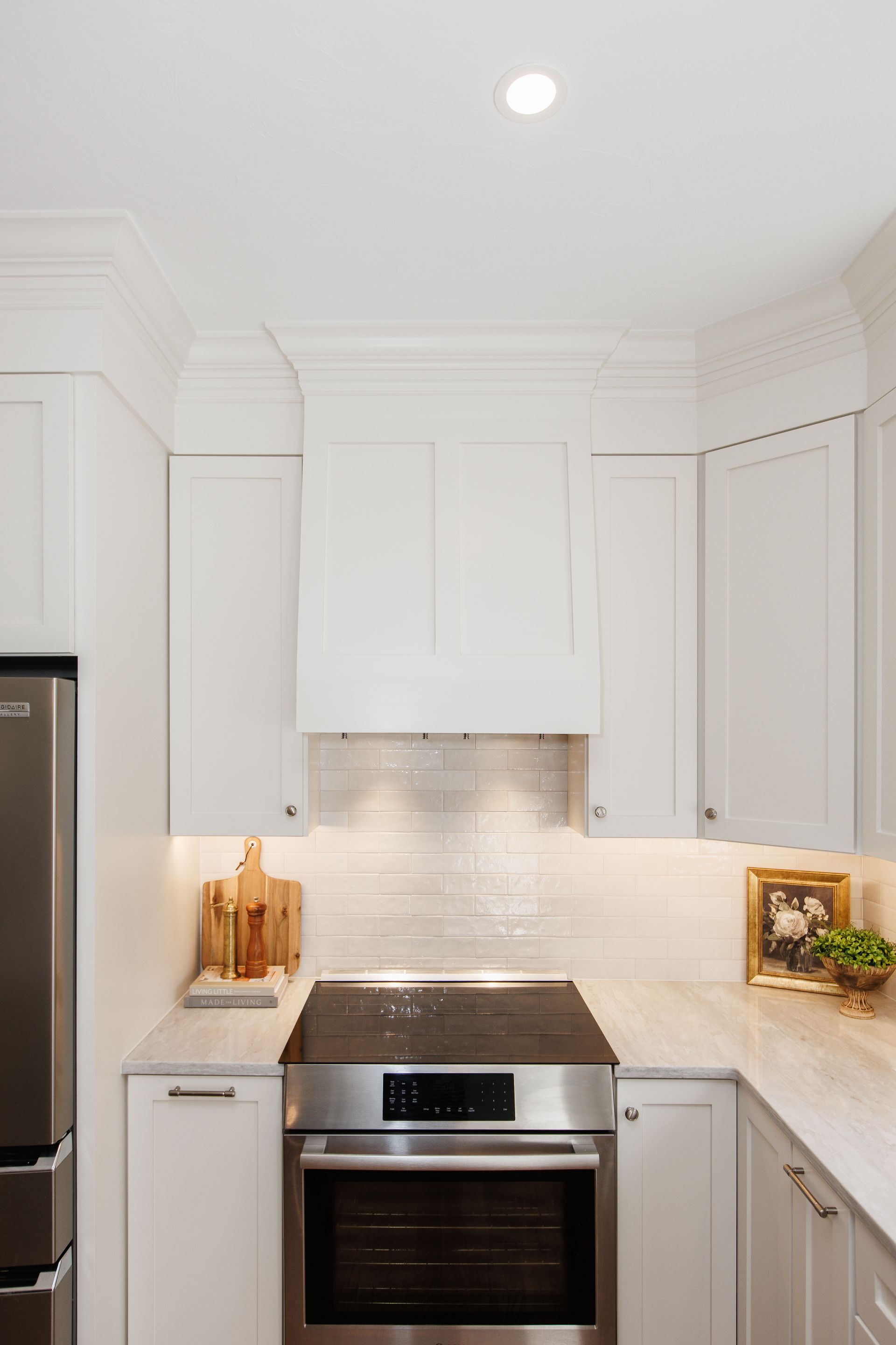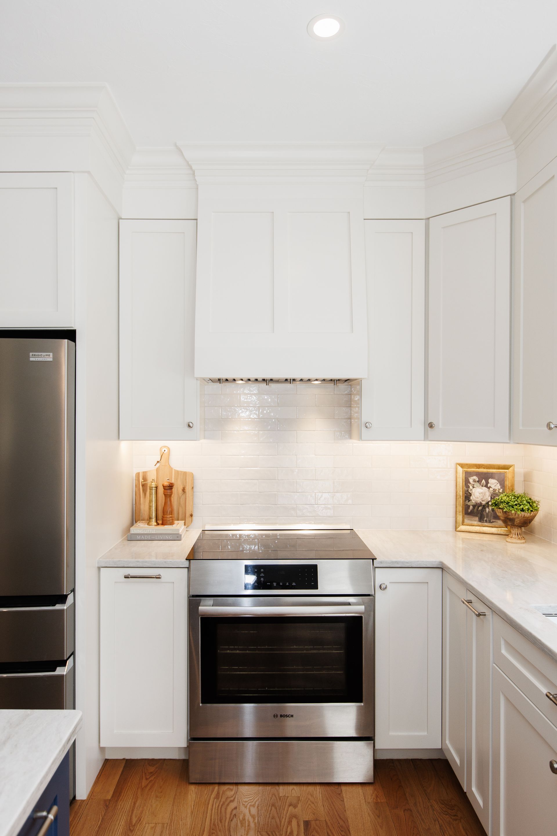 - The removal of the over-the-range microwave, replaced with a custom-built hood for a clean, high-end feel.