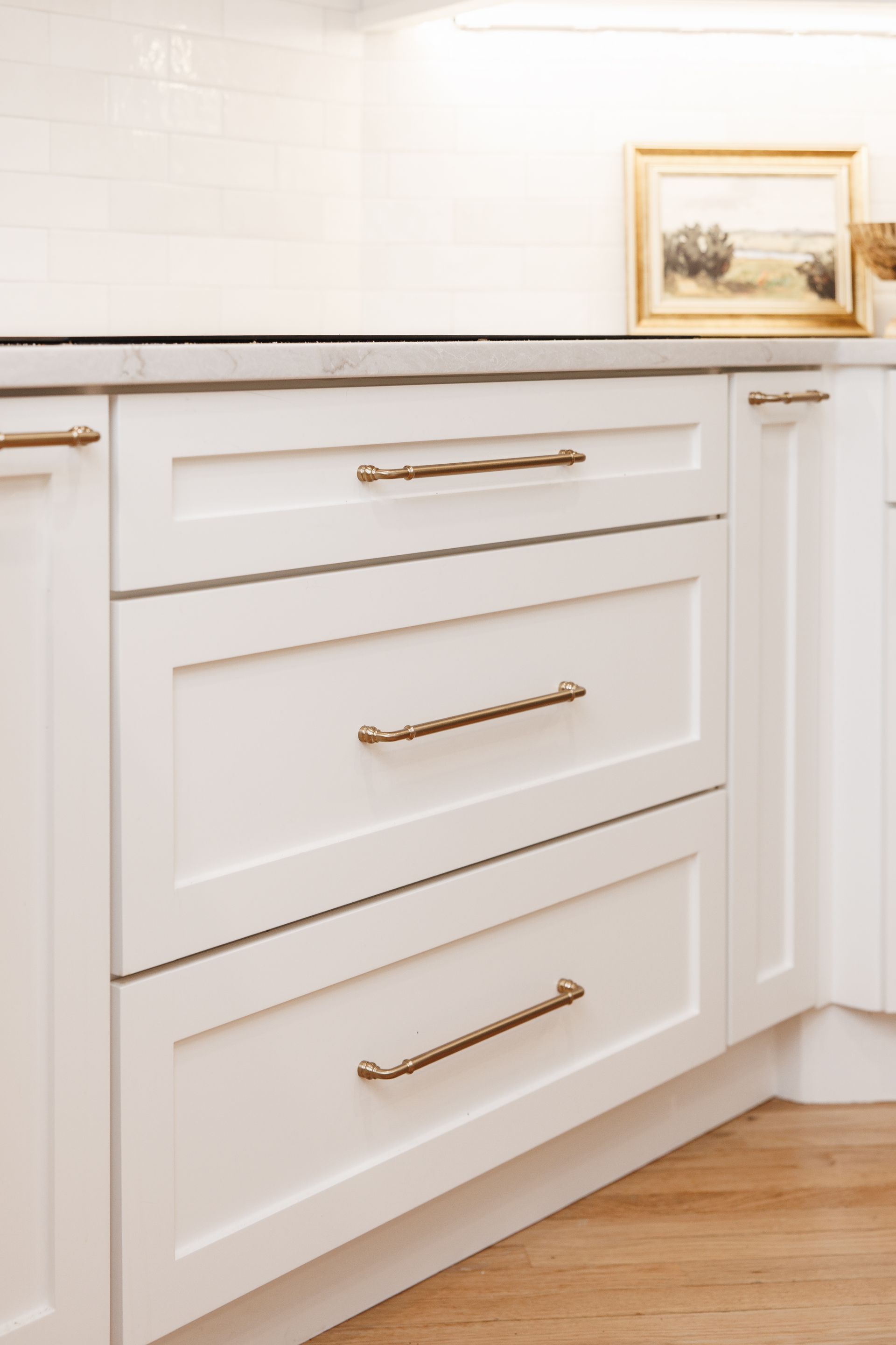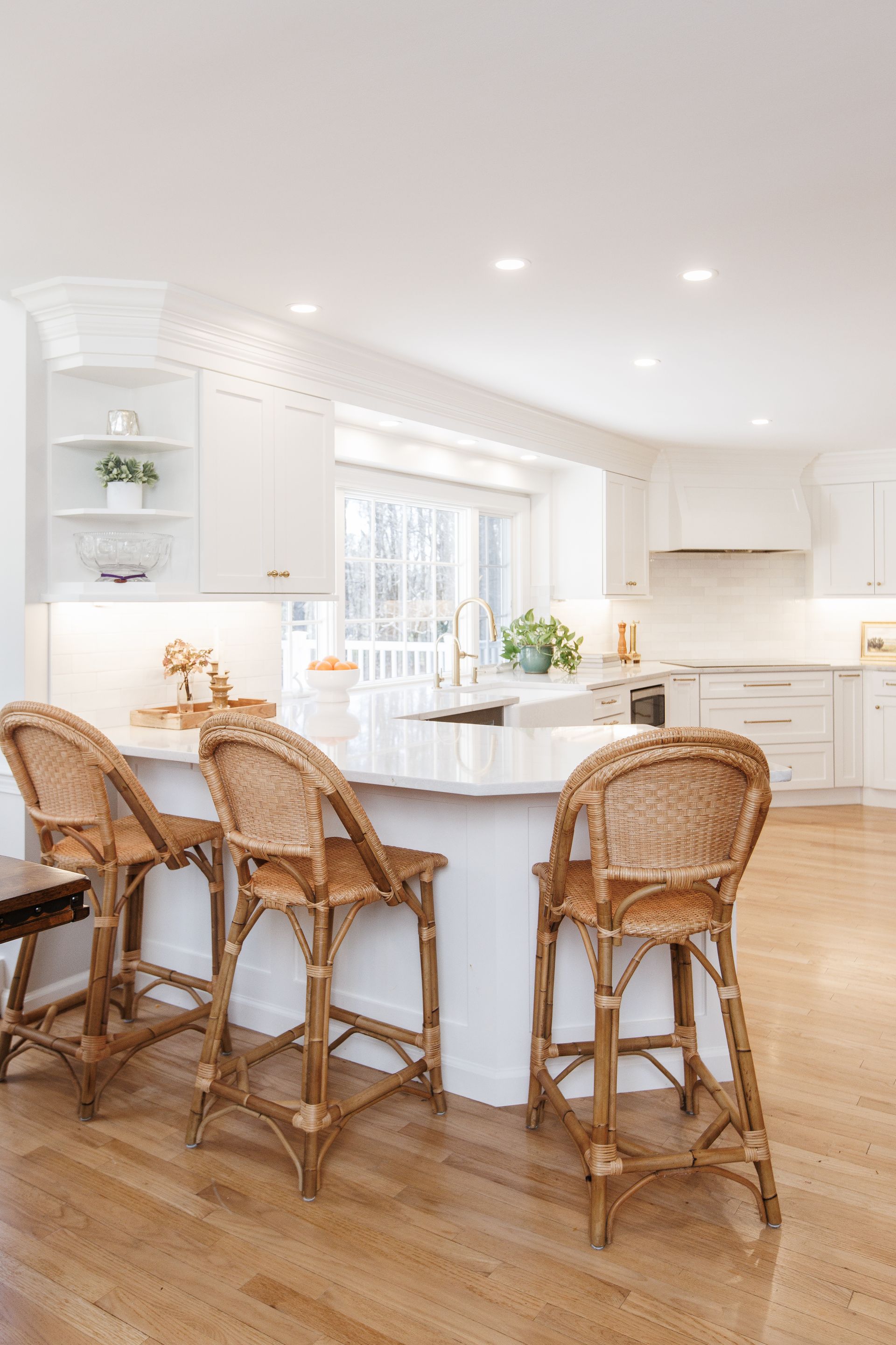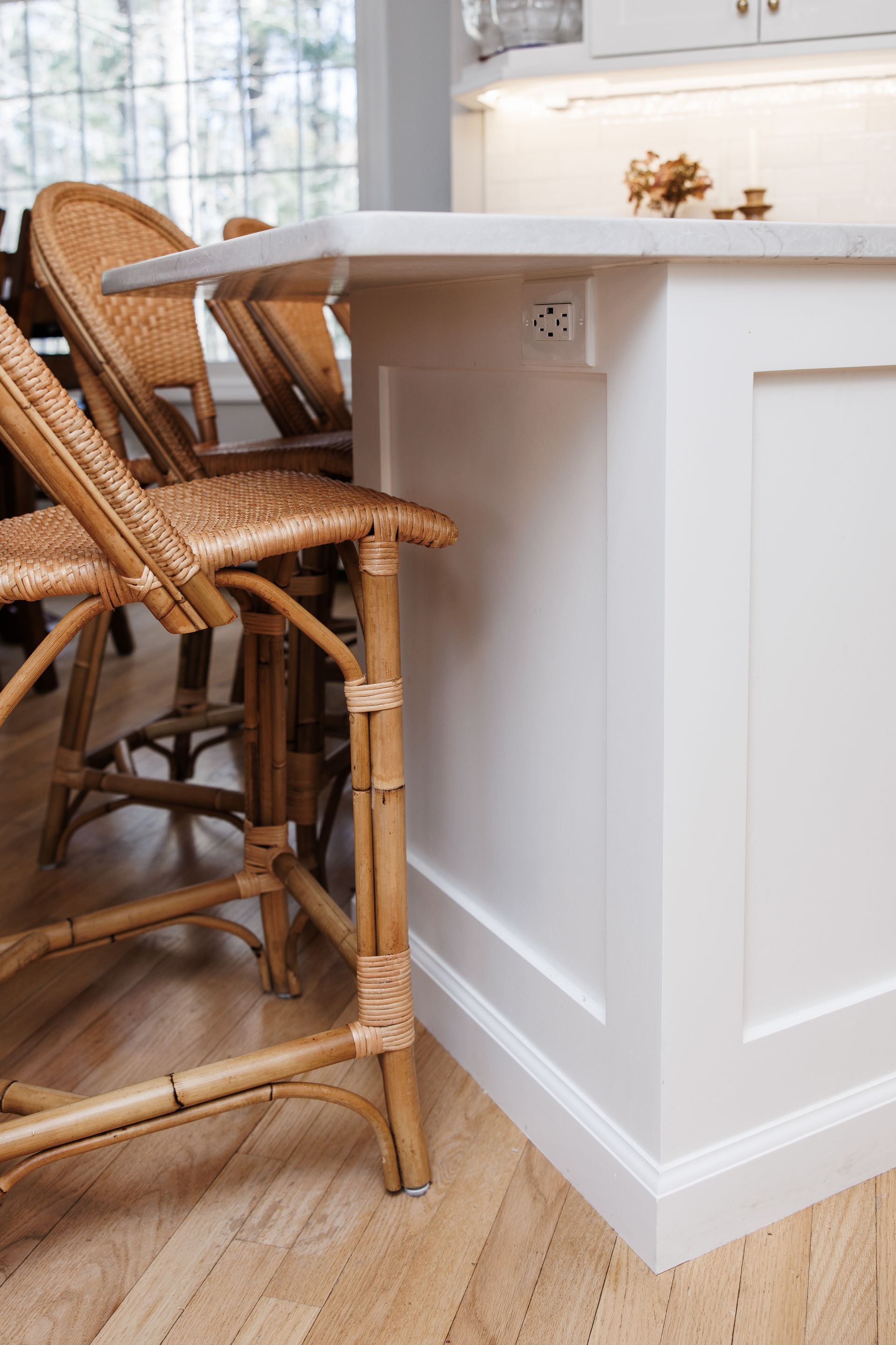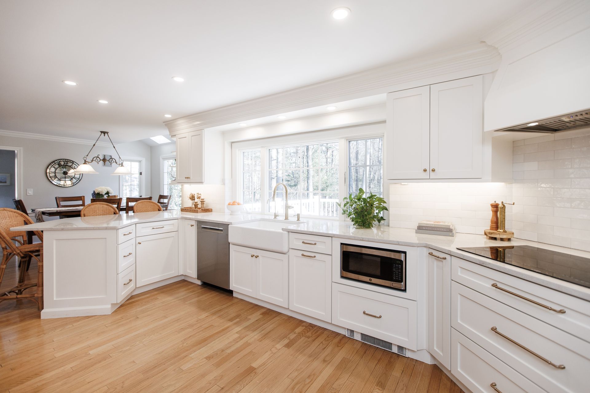 The existing cabinets were in good shape, so rather than replacing them, we preserved their structure and gave them a modern update. This included painting the cabinets and upgrading to sleek shaker-style doors and drawers for a timeless look. We also added an inset panel facade to the peninsula, providing a clean, custom touch that elevated the space’s overall aesthetic.