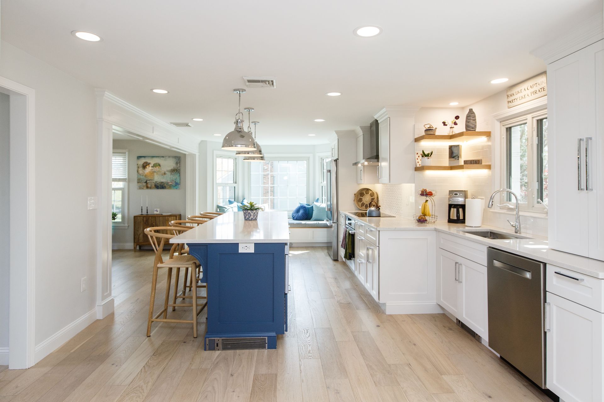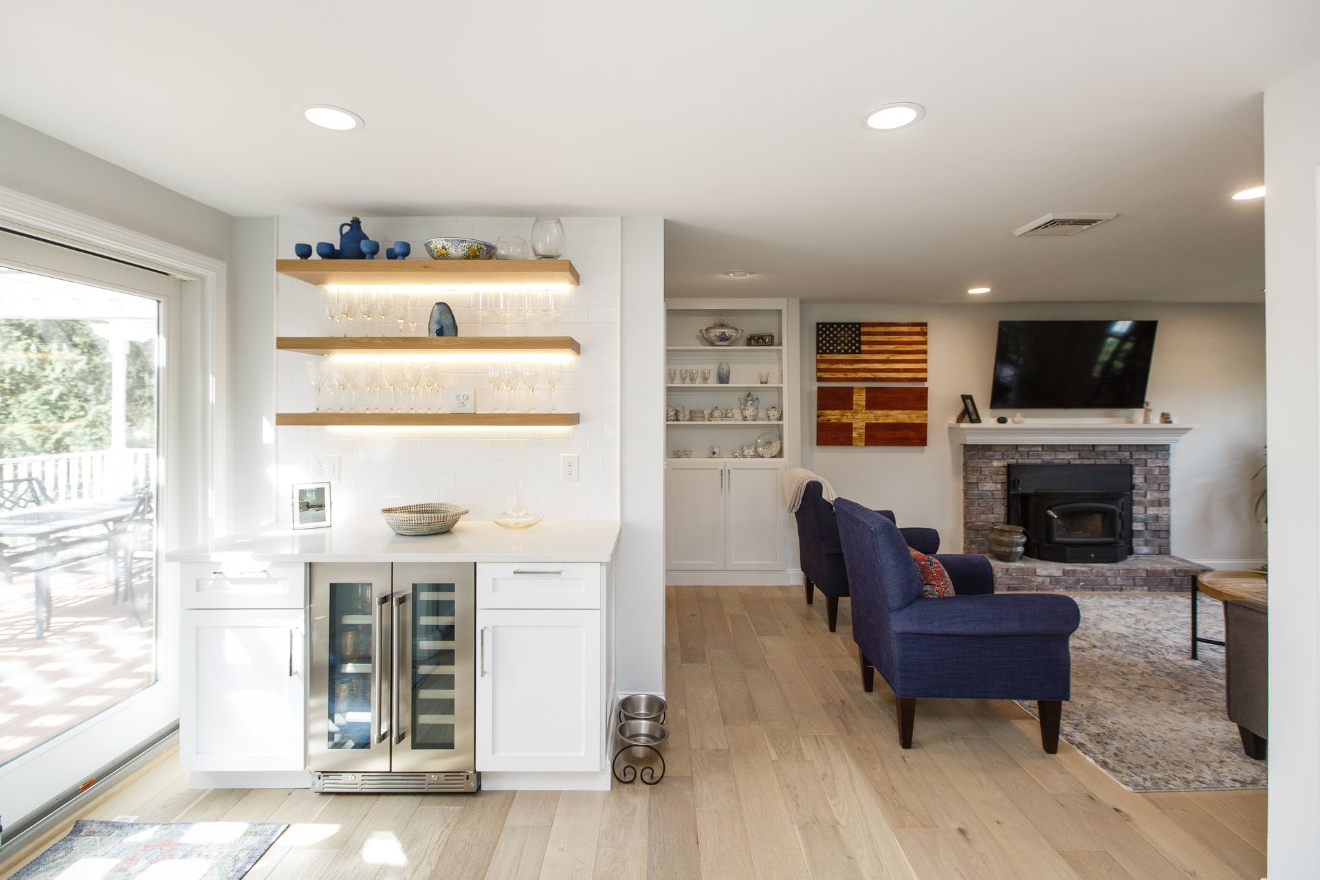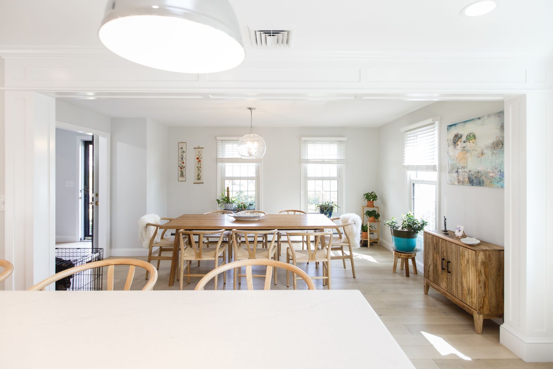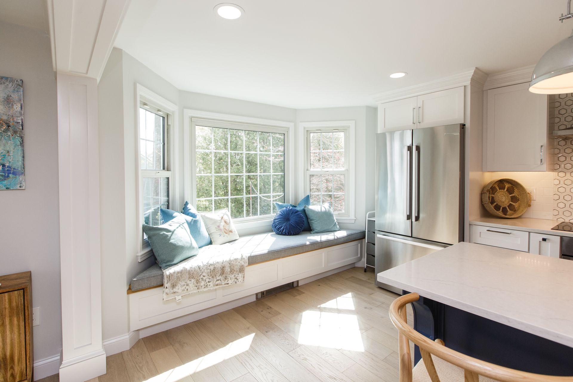 A standout addition to the space is a custom-built bench below the bay window in the former dining room. This inviting nook not only enhances the home's warmth and charm but also serves multiple purposes—offering a bright and cozy place to rest your feet while cooking, curl up with a book, or tackle homework. It’s a perfect example of how thoughtful design can make a home feel both stylish and lived-in.