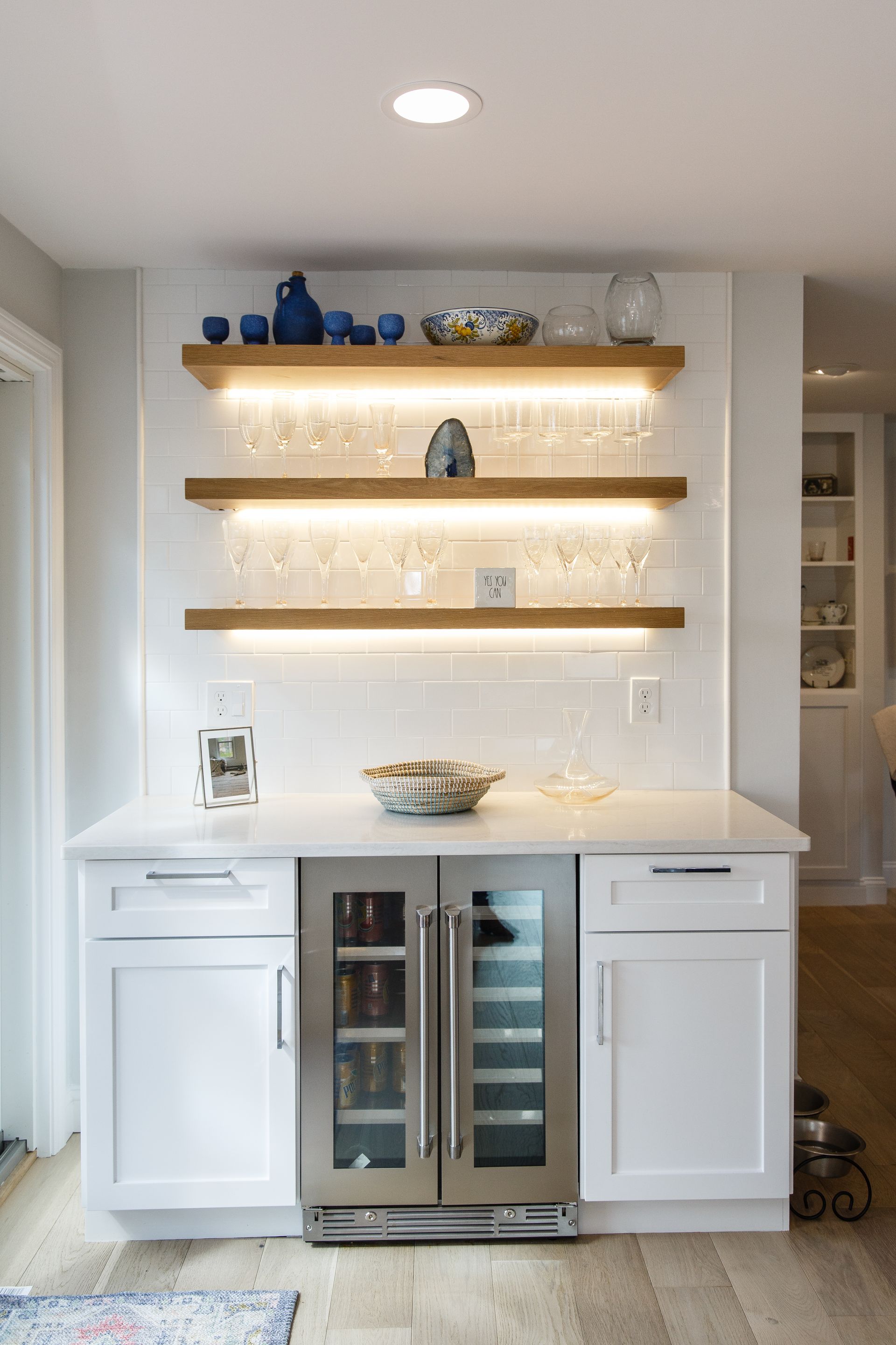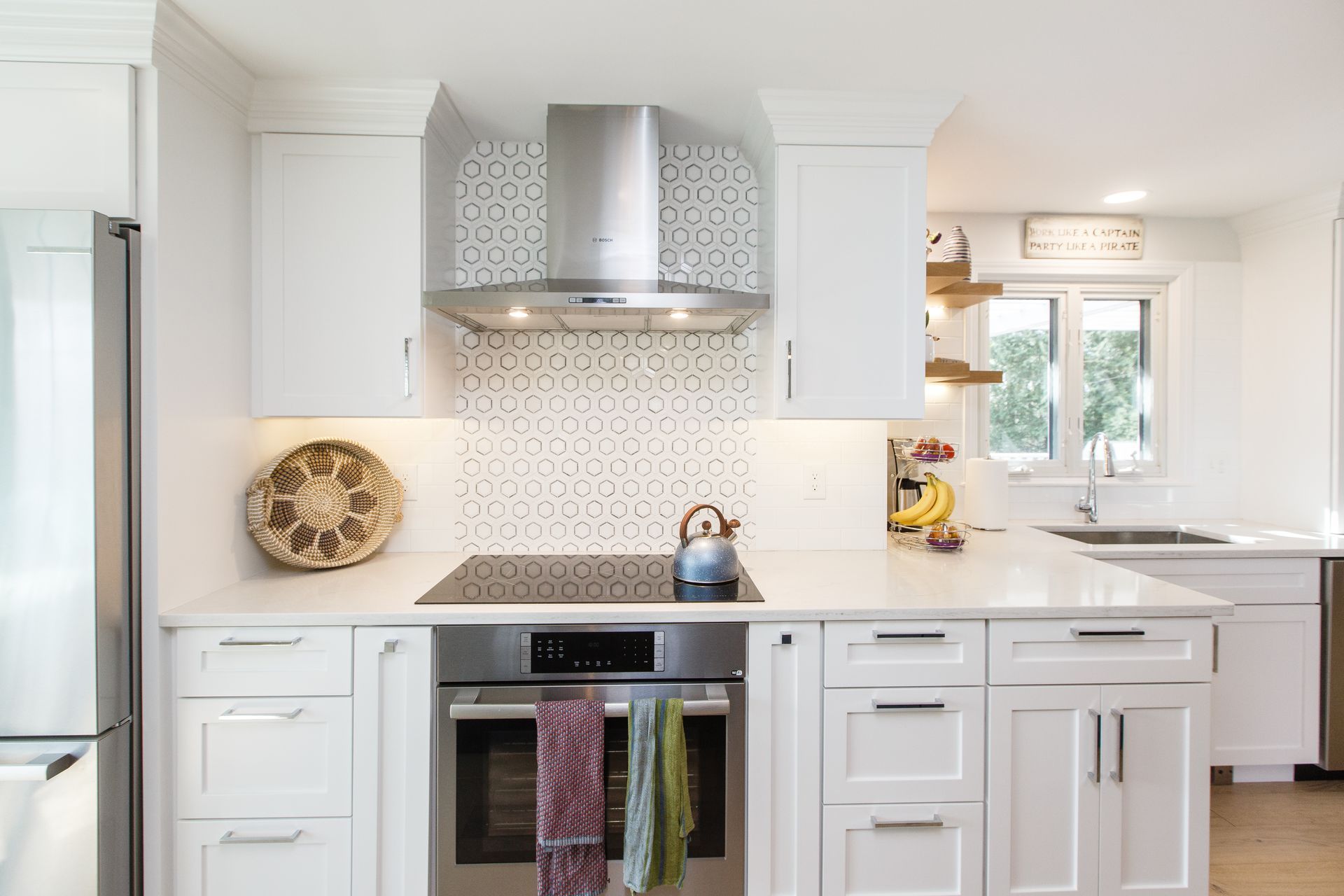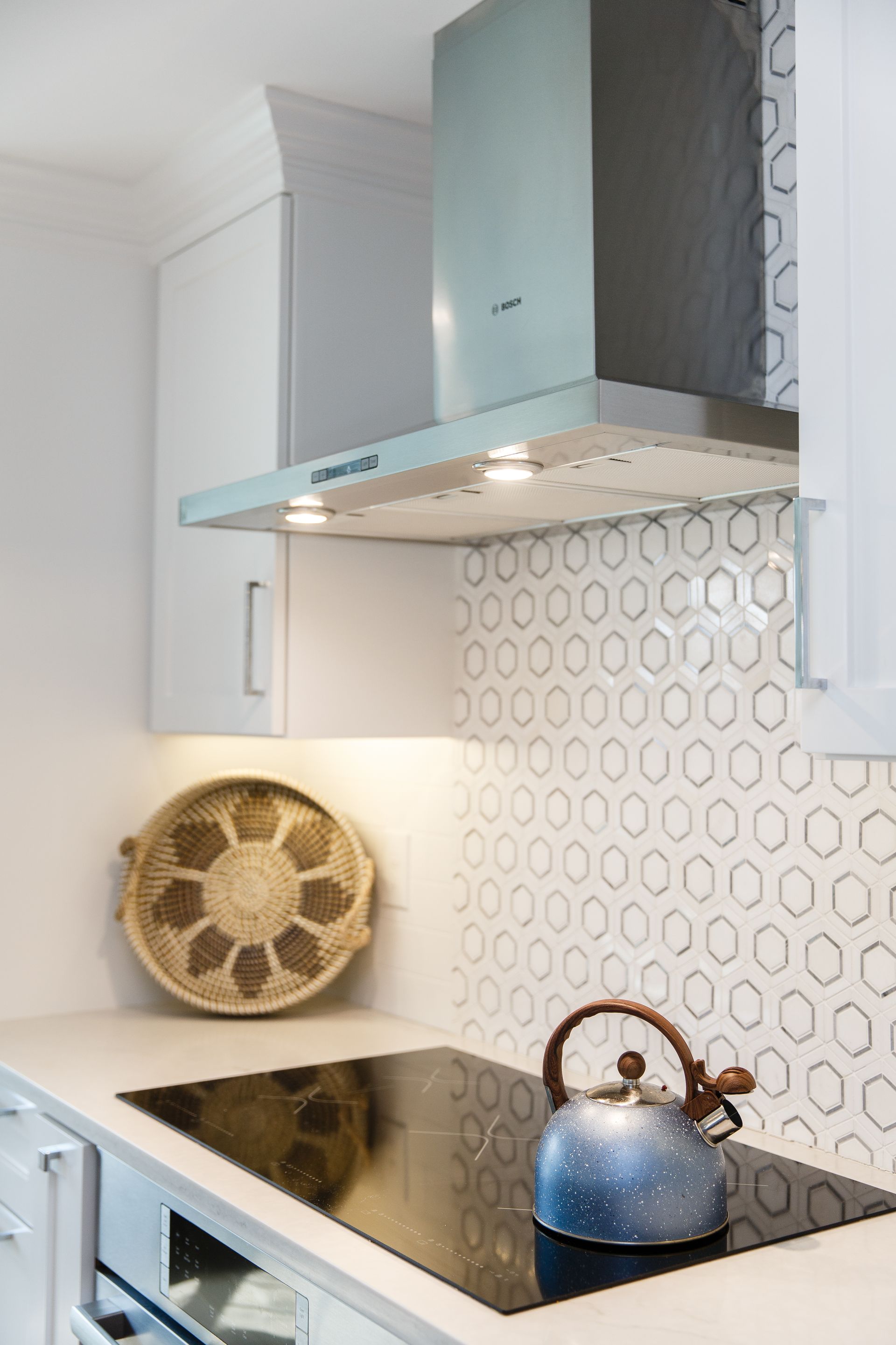 No Scandinavian-inspired kitchen is complete without an appreciation for craftsmanship and natural materials. Wood floating shelves in a cozy kitchen corner and above the beverage bar introduce warmth and texture, complementing the sleek design. The backsplash, a staple of any kitchen renovation, is a combination of classic white subway tile and a stunning accent over the stove—white hexagon tiles outlined in soft gray, adding subtle depth and dimension.