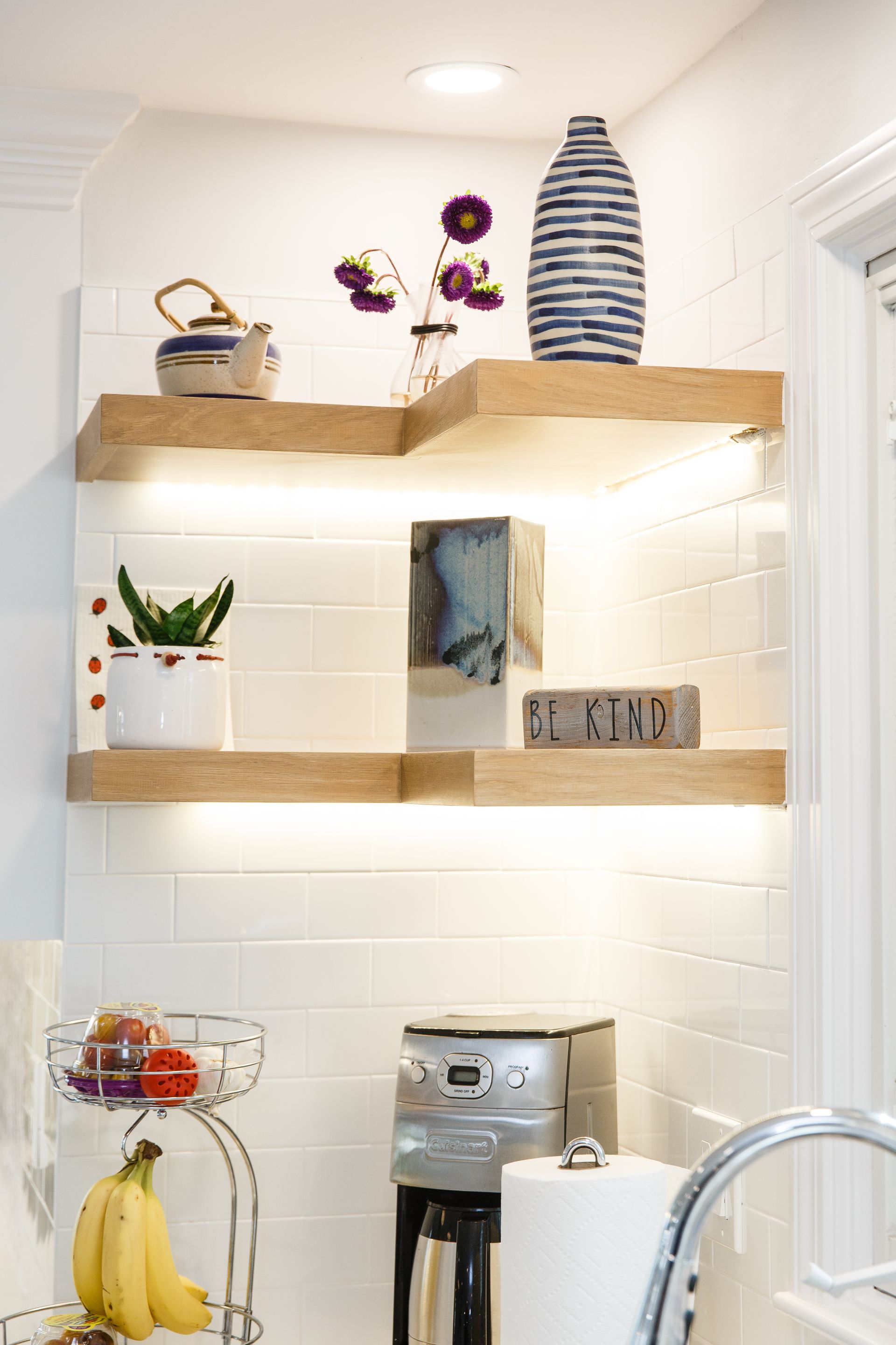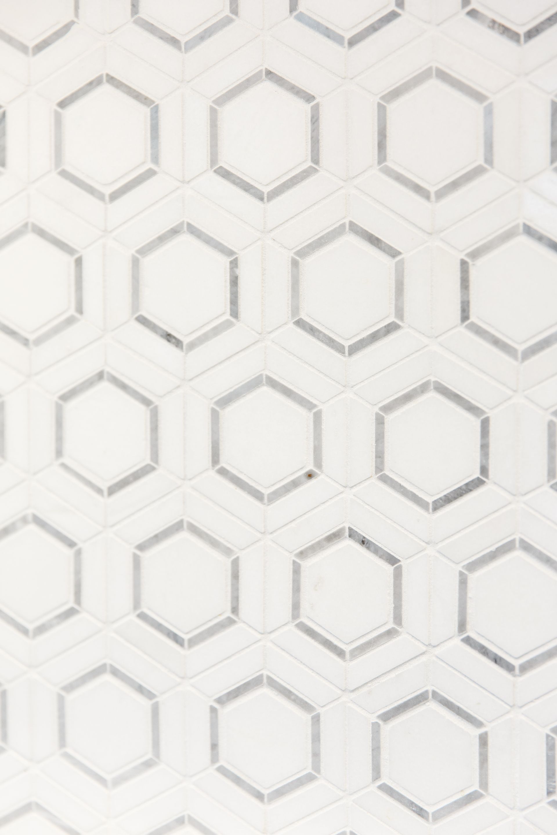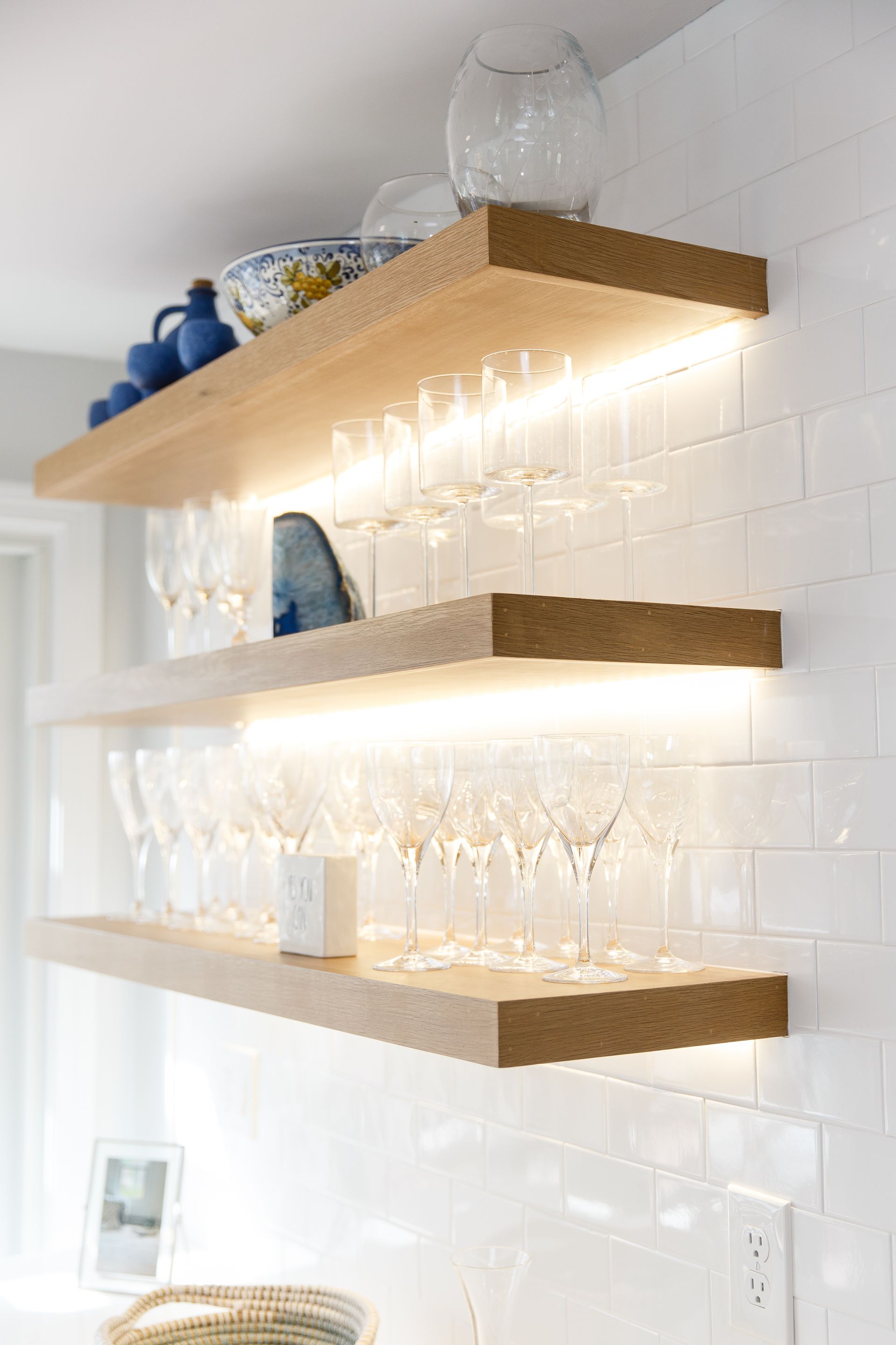 No Scandinavian-inspired kitchen is complete without an appreciation for craftsmanship and natural materials. Wood floating shelves in a cozy kitchen corner and above the beverage bar introduce warmth and texture, complementing the sleek design. The backsplash, a staple of any kitchen renovation, is a combination of classic white subway tile and a stunning accent over the stove—white hexagon tiles outlined in soft gray, adding subtle depth and dimension.