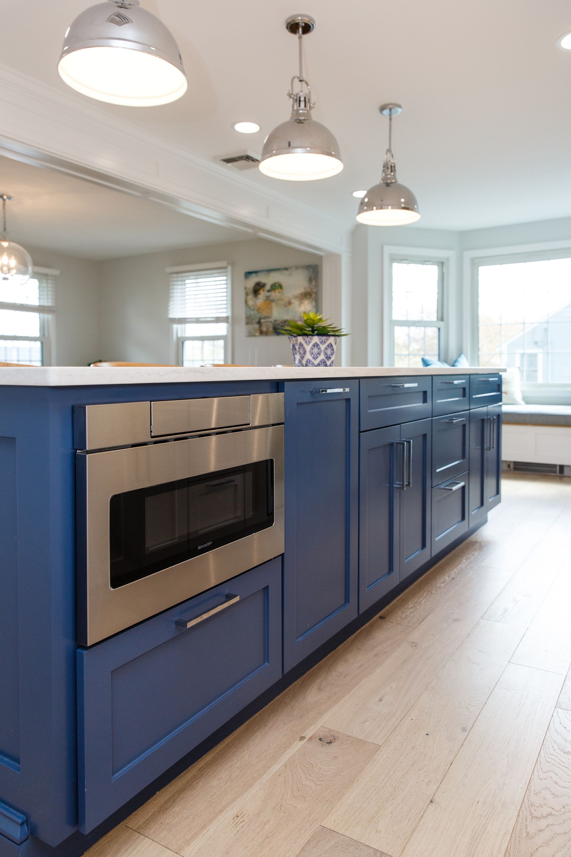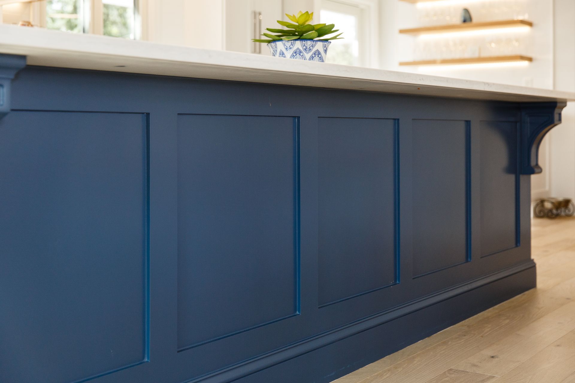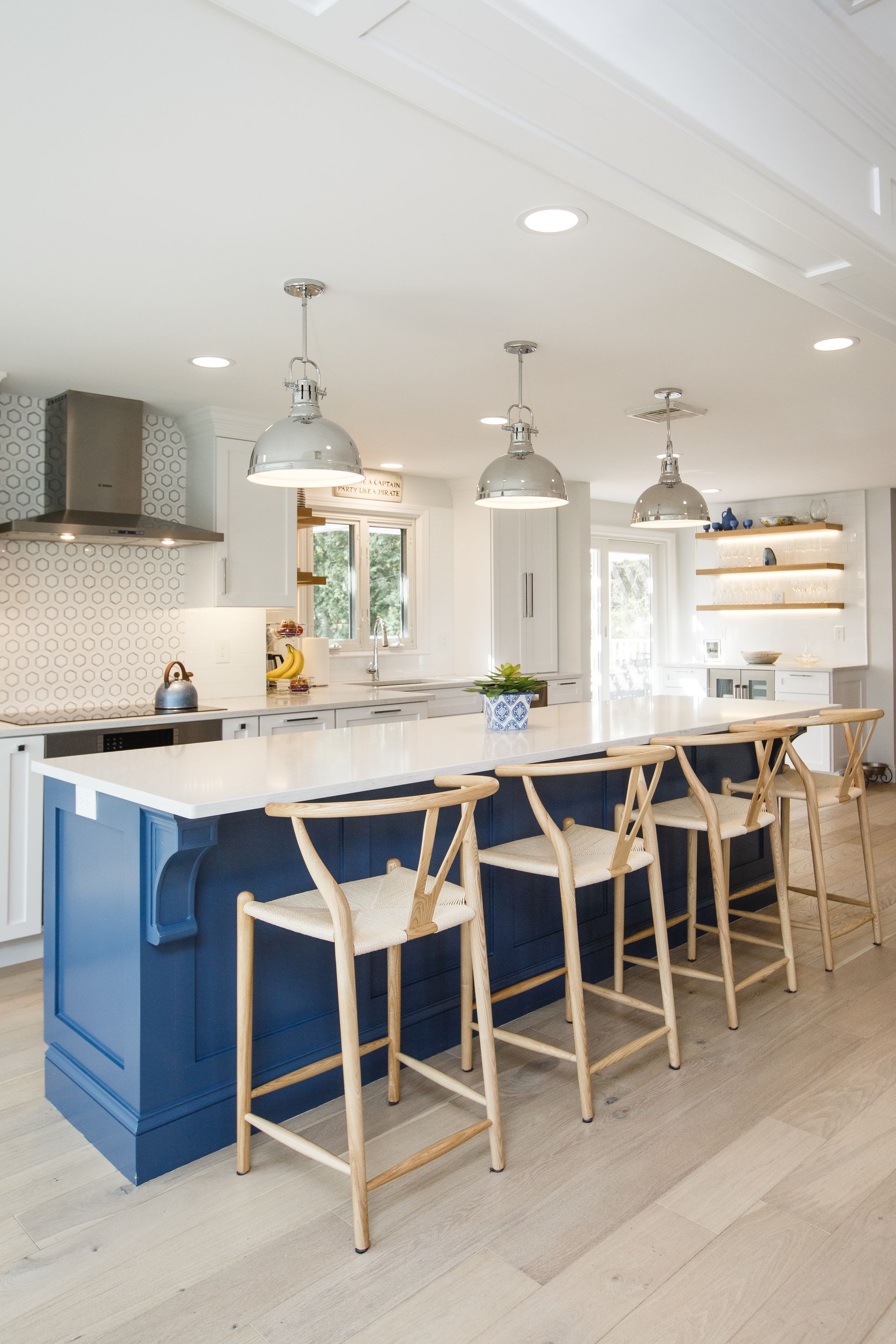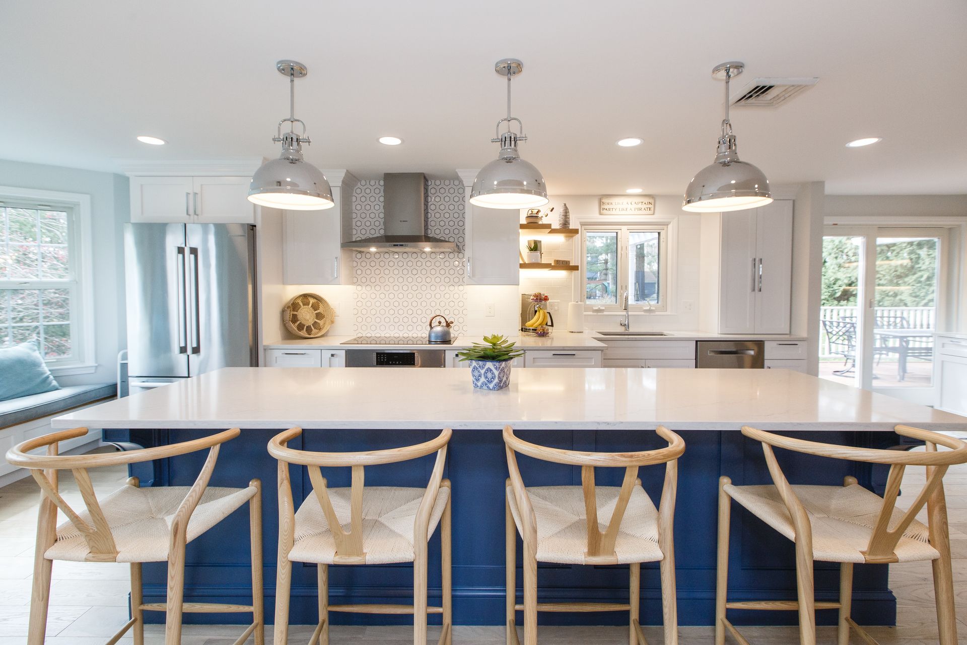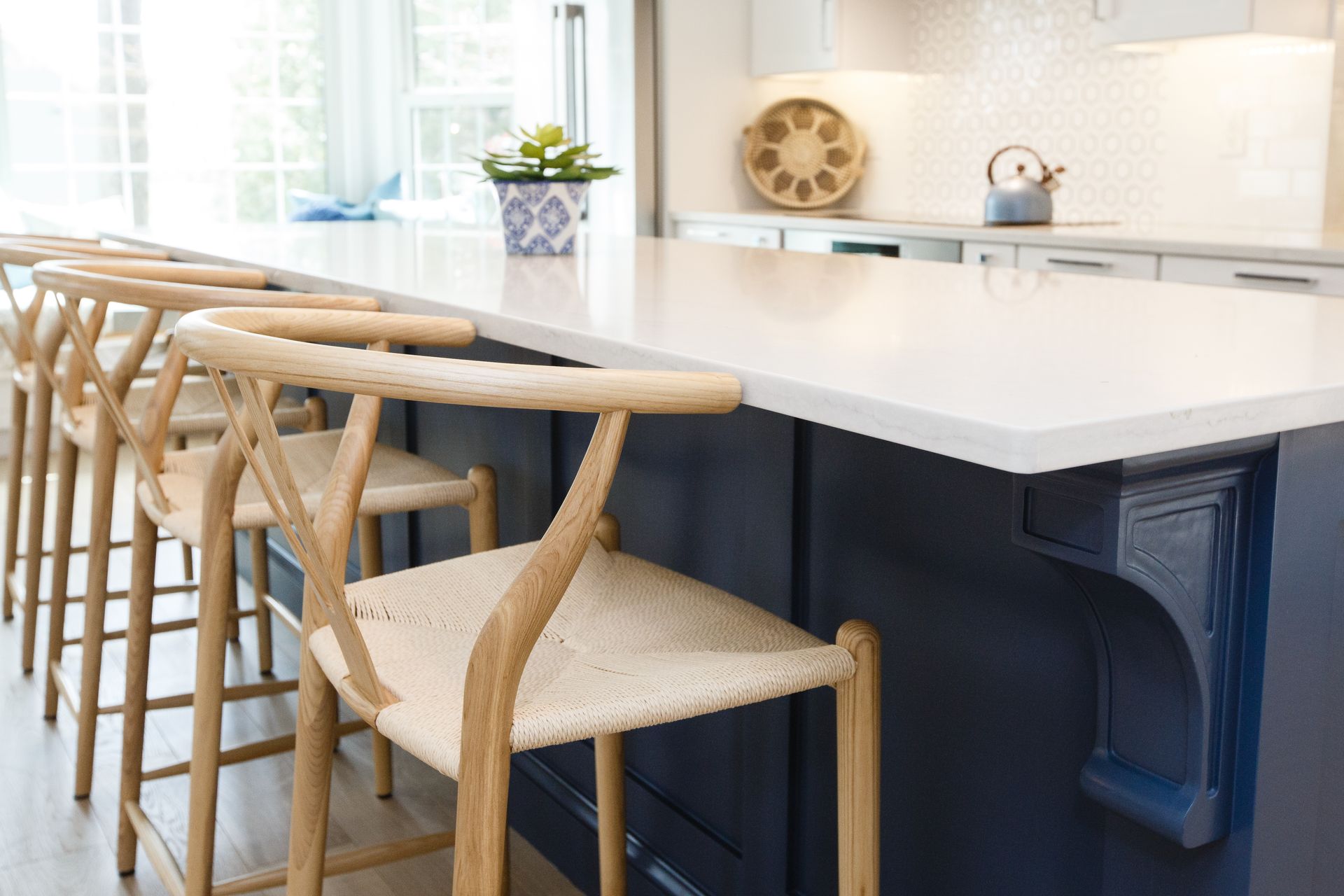 Designer Brenda Chiaradonna, of House of Gray and White, curated a timeless palette that balances contrast with warmth. The perimeter cabinets, painted crisp white, create a fresh and airy feel, while the navy blue island adds a striking focal point. All cabinetry features classic shaker-style doors, reinforcing the clean lines and simplicity of Scandinavian aesthetics.