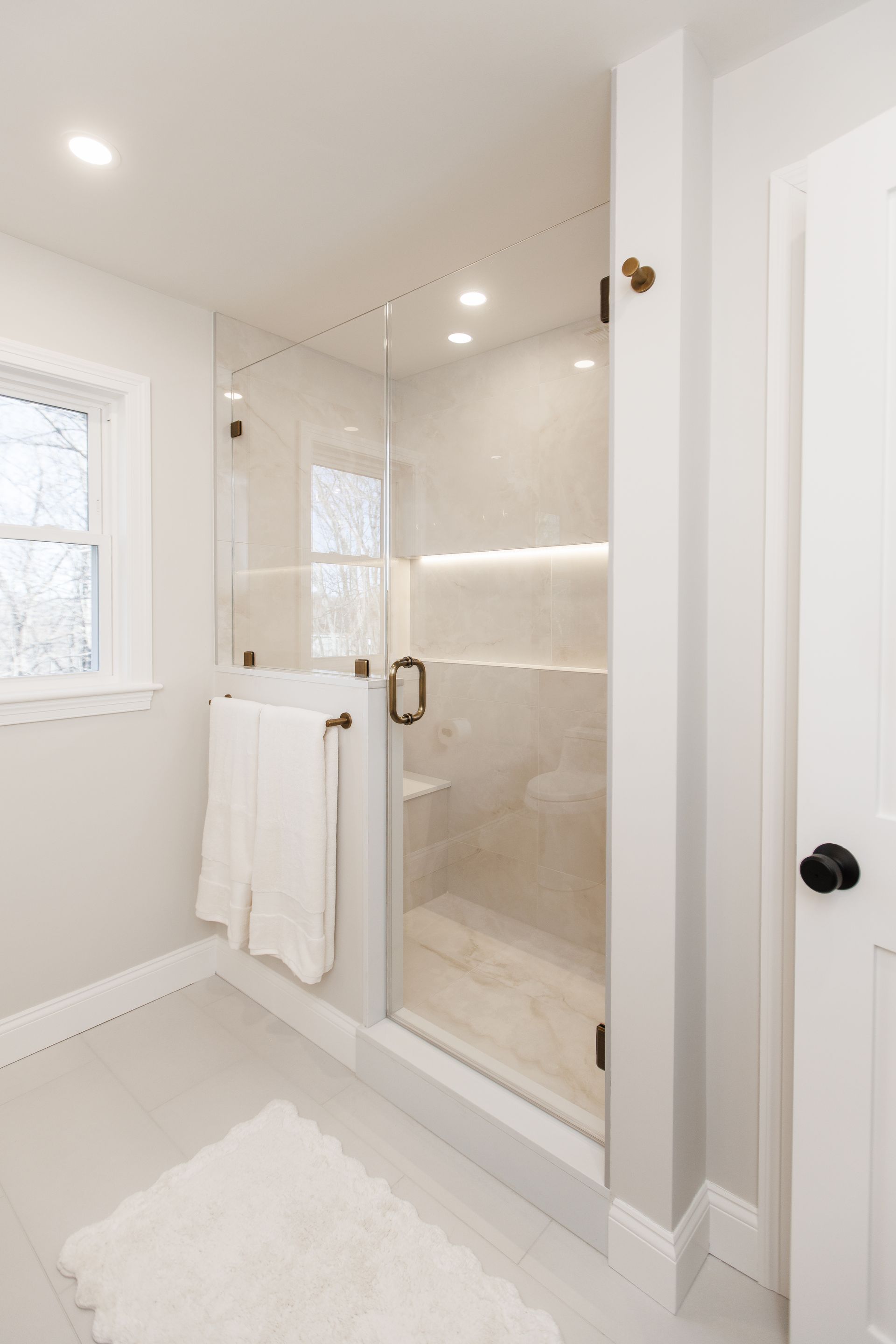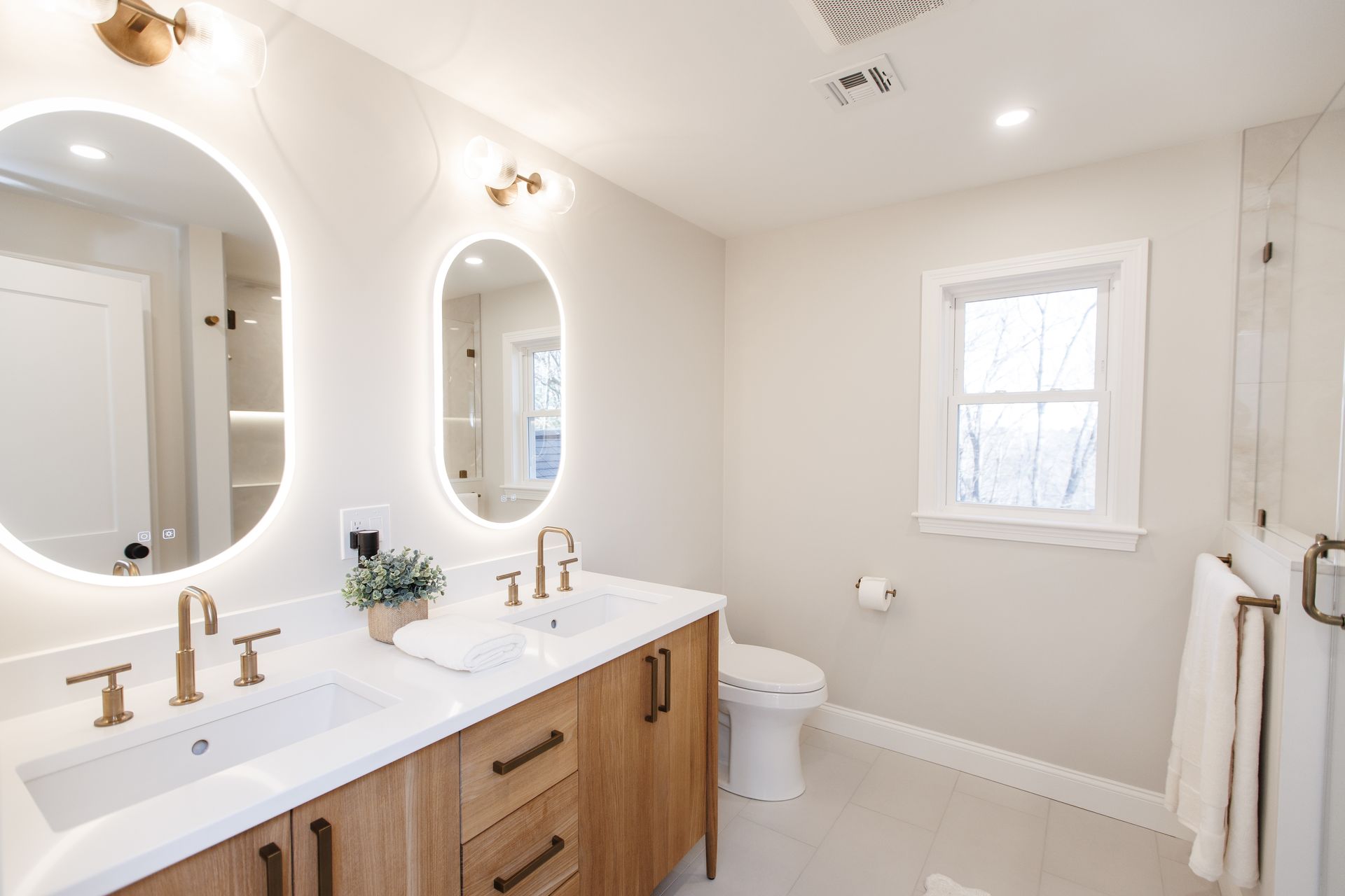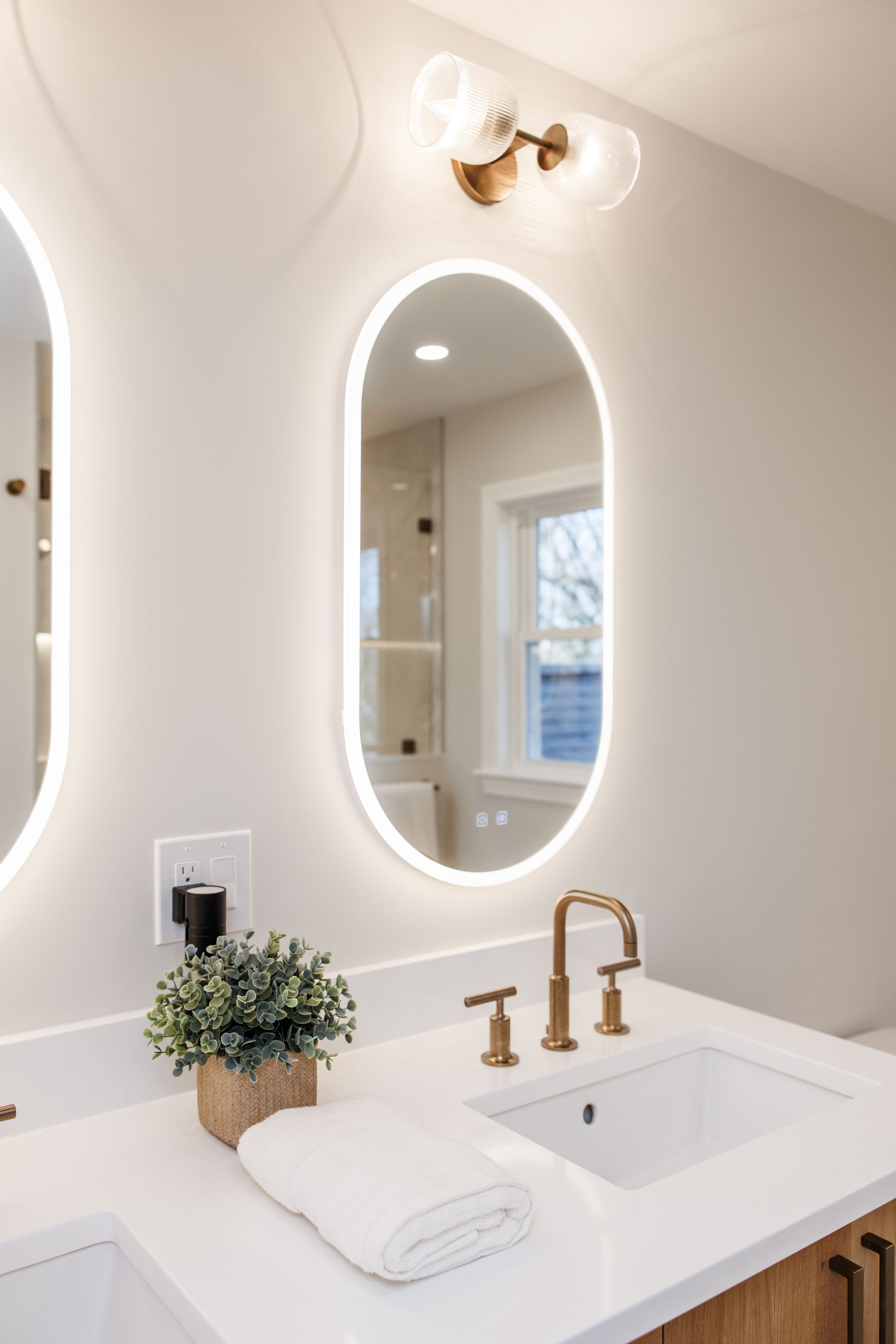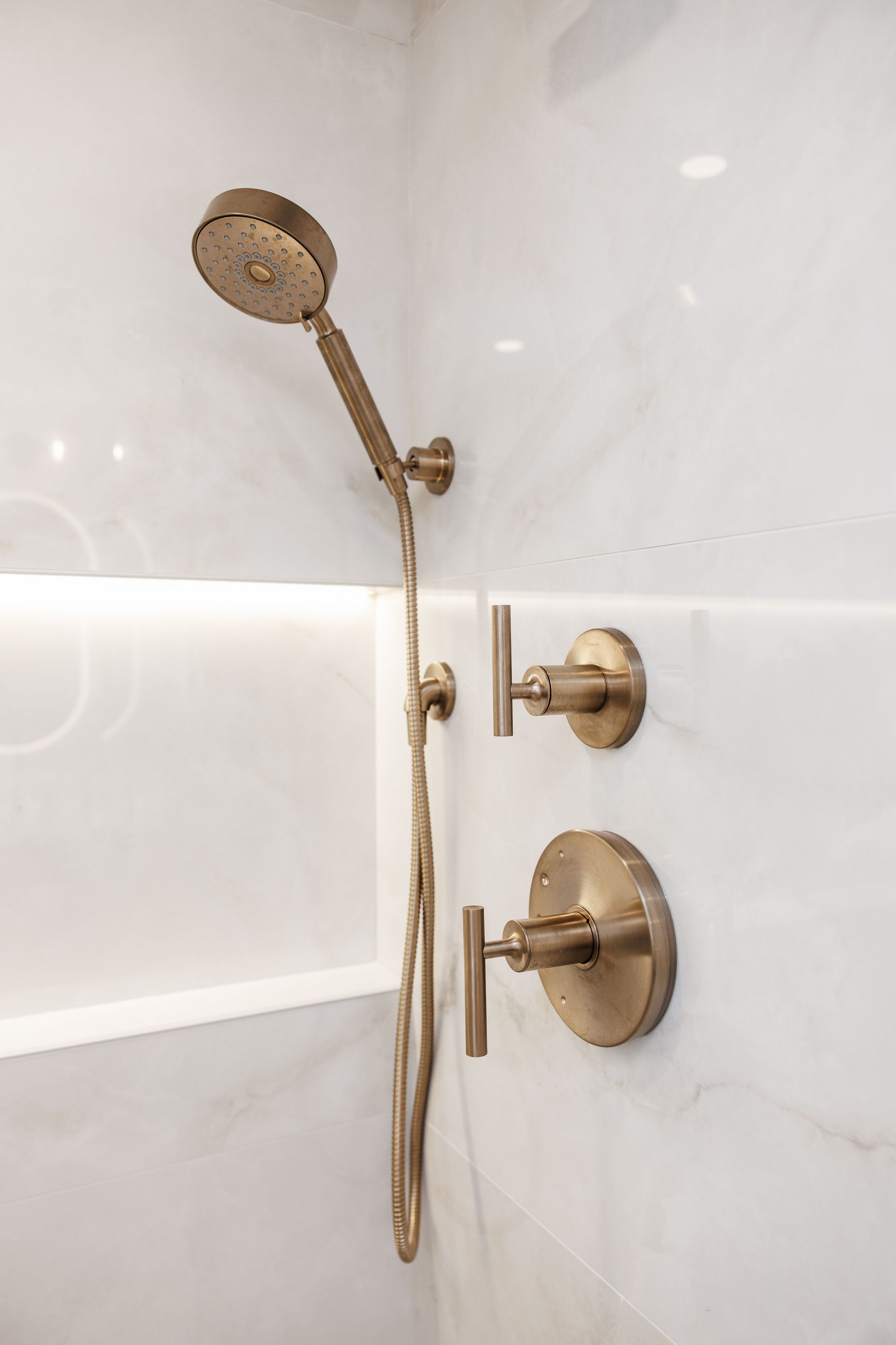 Above the sinks, we installed illuminated mirrors that offer a soft, ambient glow when turned on, providing both beauty and practicality. Lighting played a major role in this renovation, with another stunning addition being the illuminated shower cutouts. These built-in niches are not only functional but also serve as a design element that adds warmth and sophistication to the space.