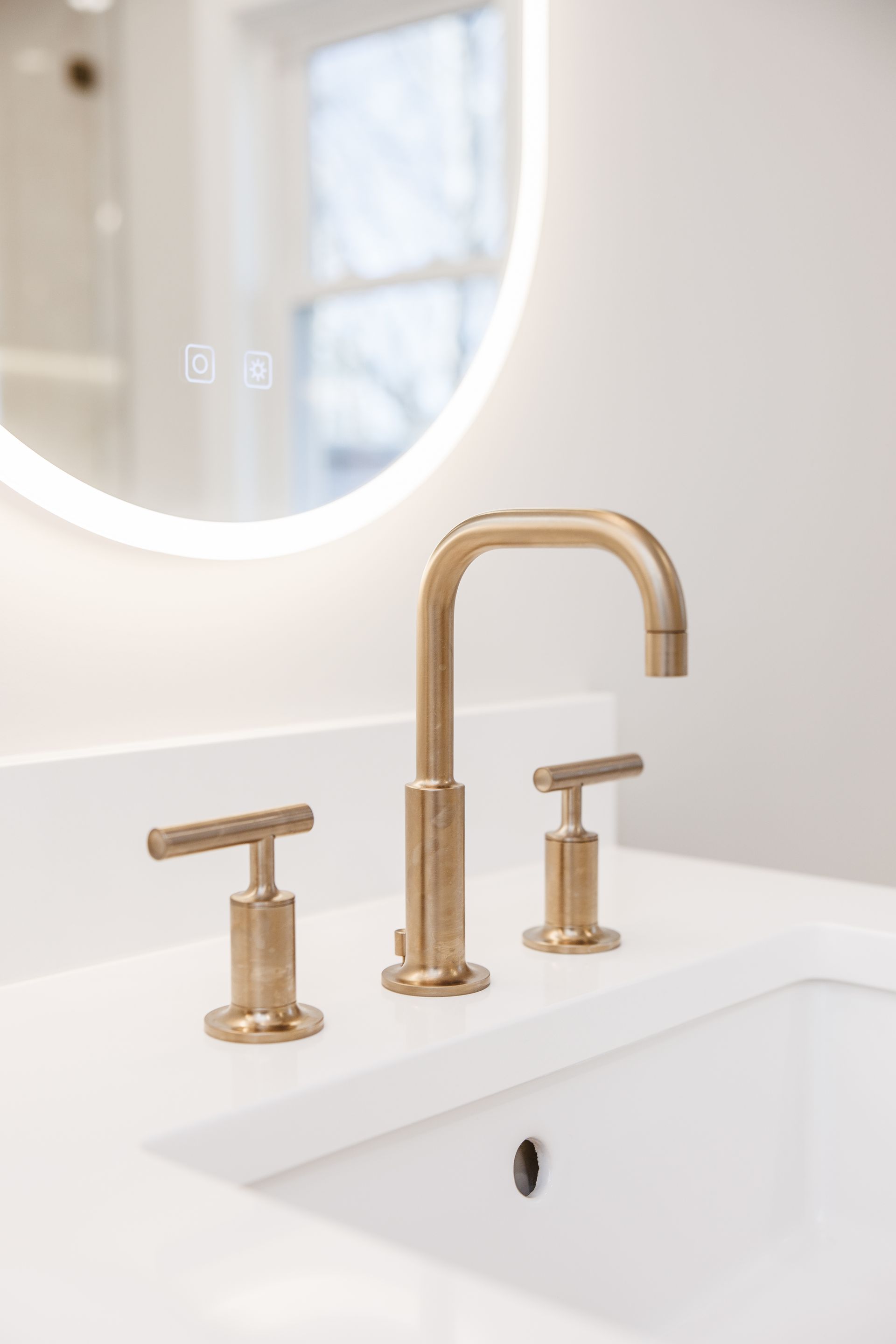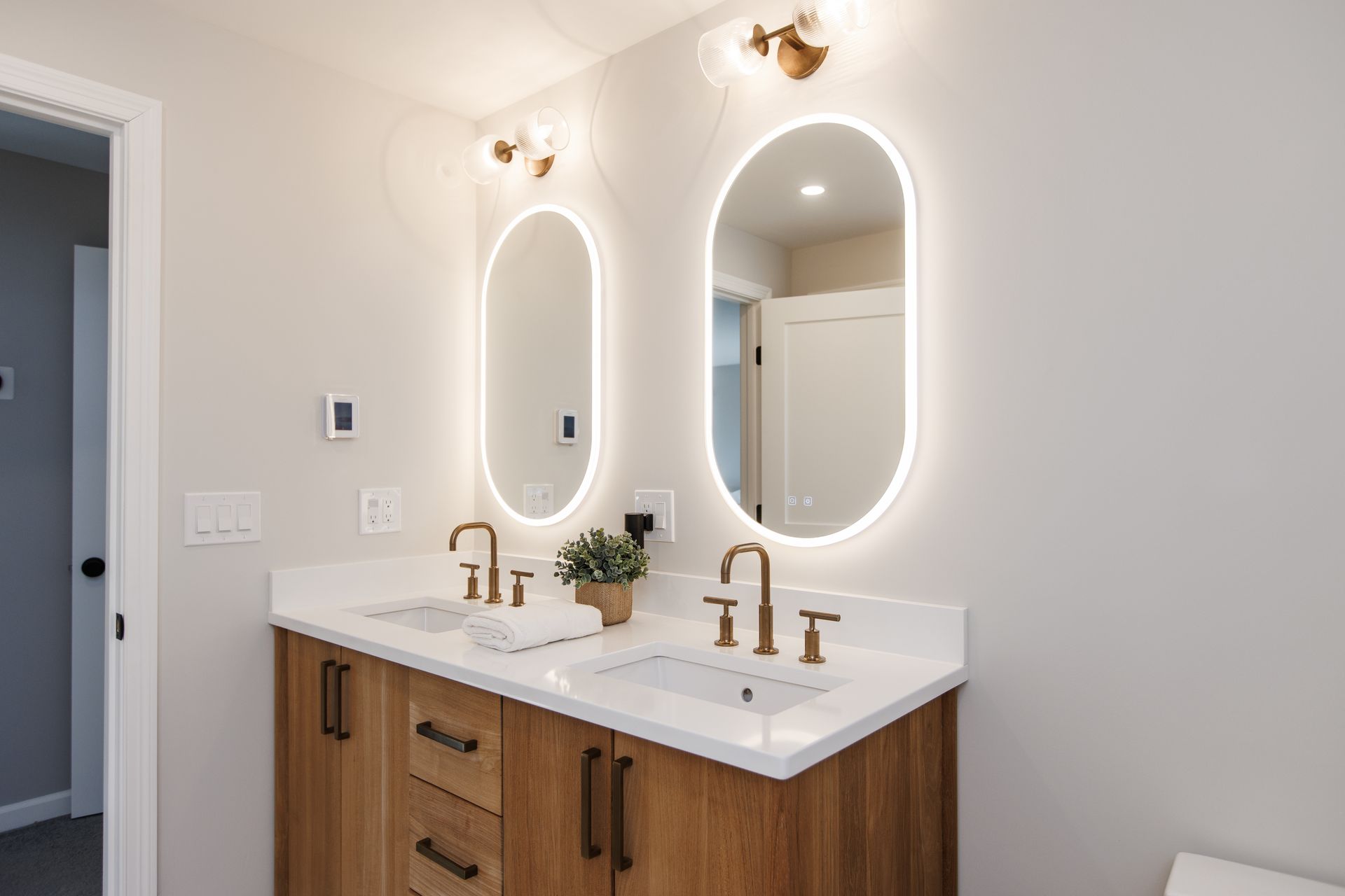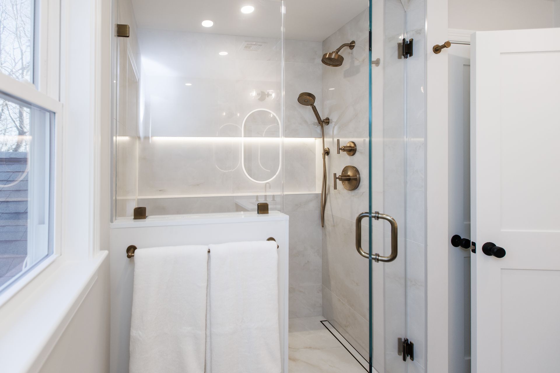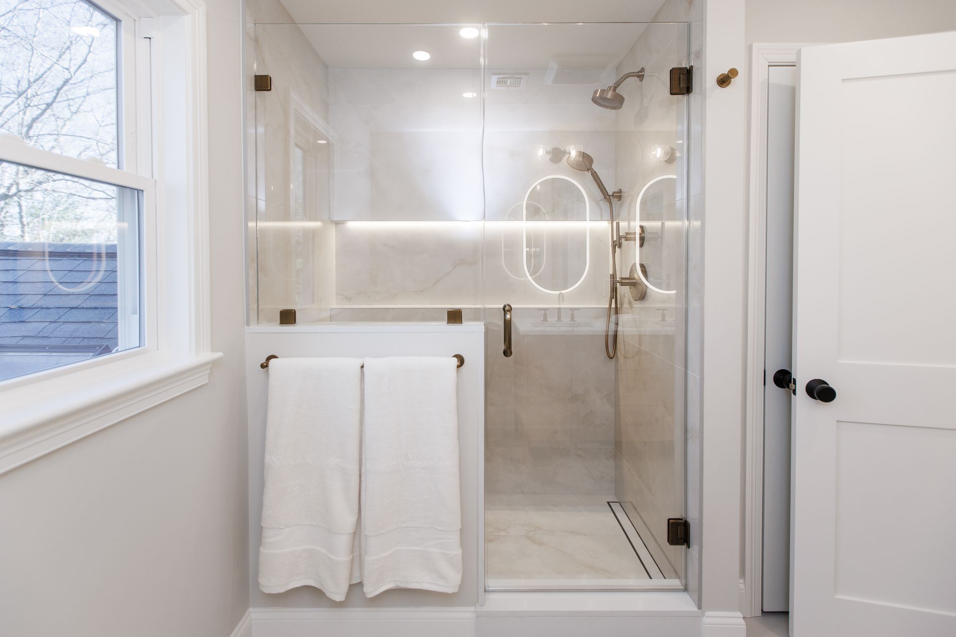 Above the sinks, we installed illuminated mirrors that offer a soft, ambient glow when turned on, providing both beauty and practicality. Lighting played a major role in this renovation, with another stunning addition being the illuminated shower cutouts. These built-in niches are not only functional but also serve as a design element that adds warmth and sophistication to the space.