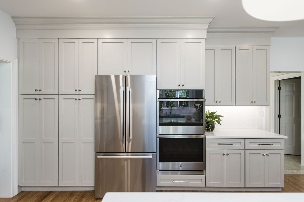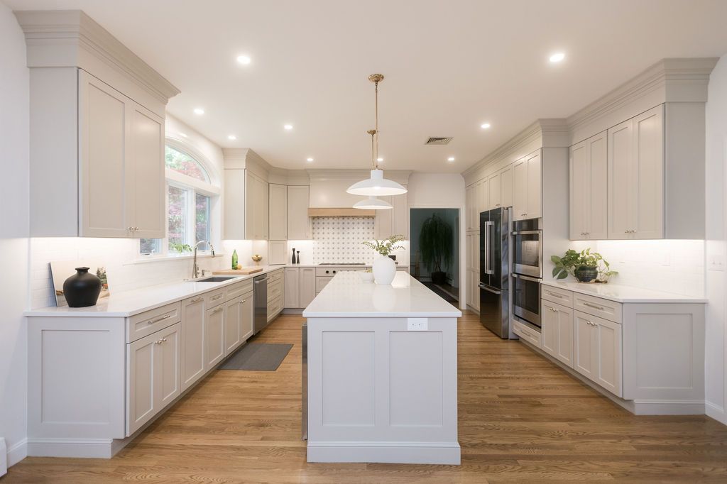 This stunning kitchen utilized existing cabinetry and some new cabinetry. To begin, the entire kitchen was demoed. The old cabinets were removed and the tile flooring ripped up. Some of the existing cabinet bases were than placed back in the space and new cabinetry was built around it to create this functional layout.