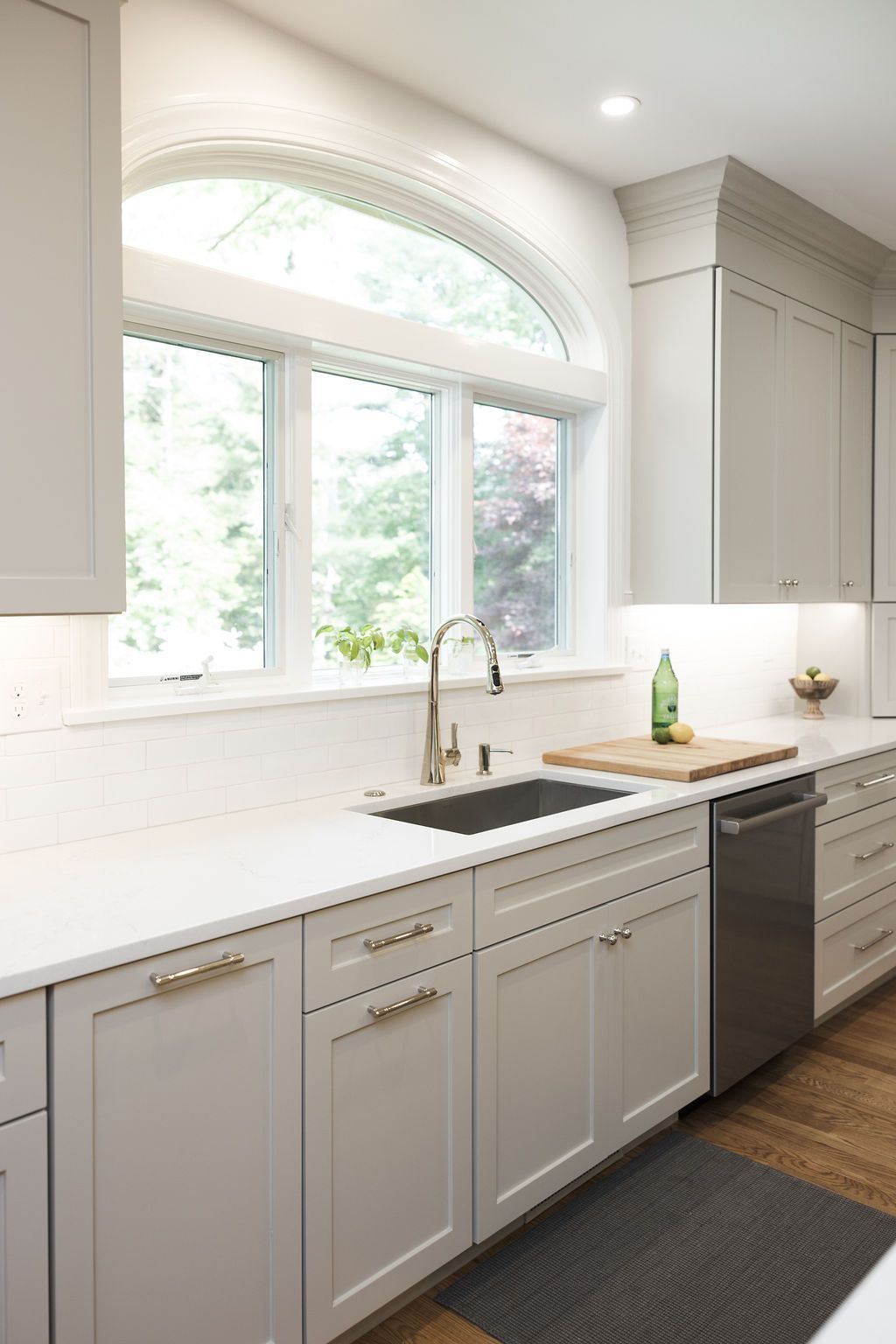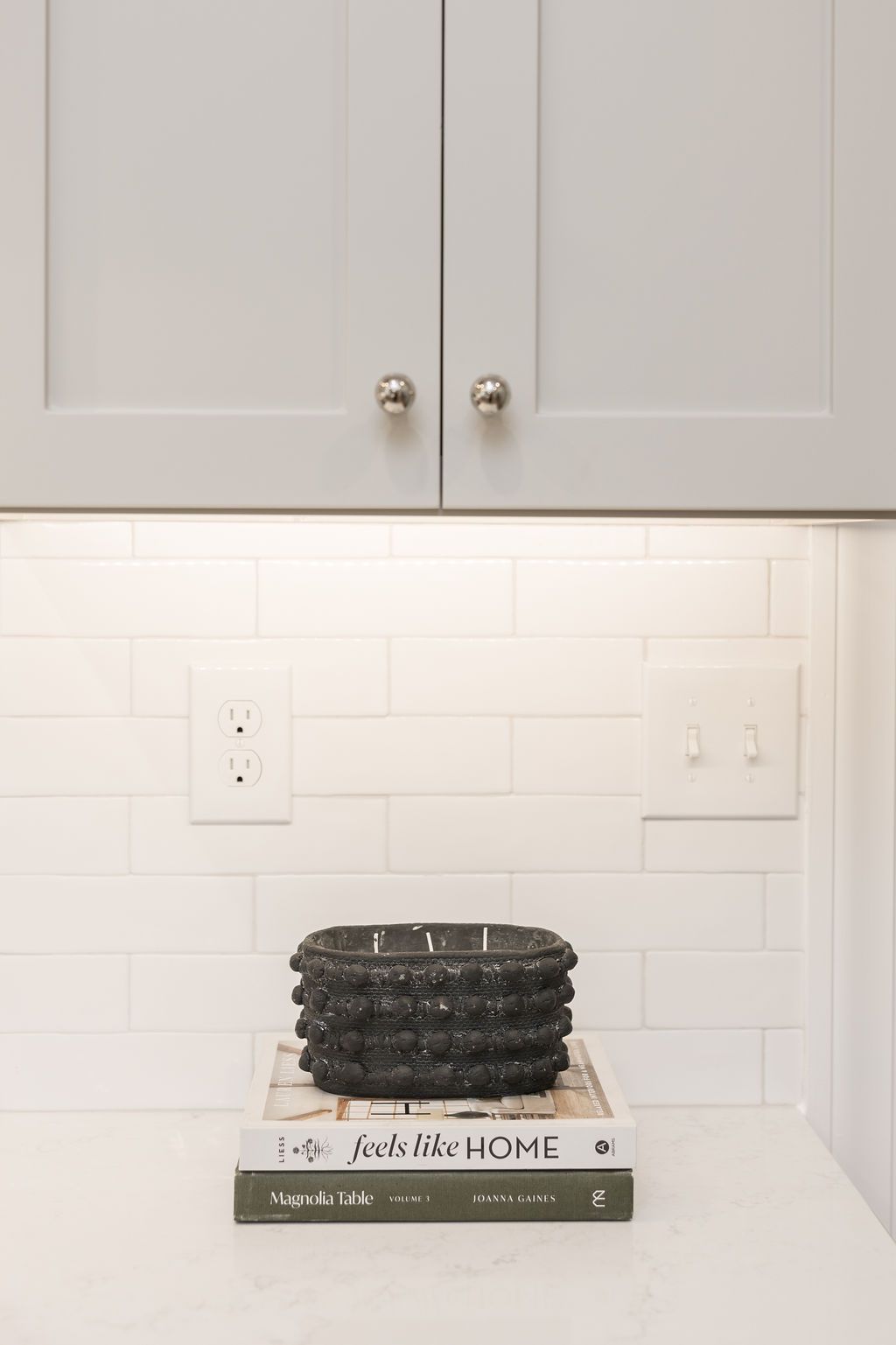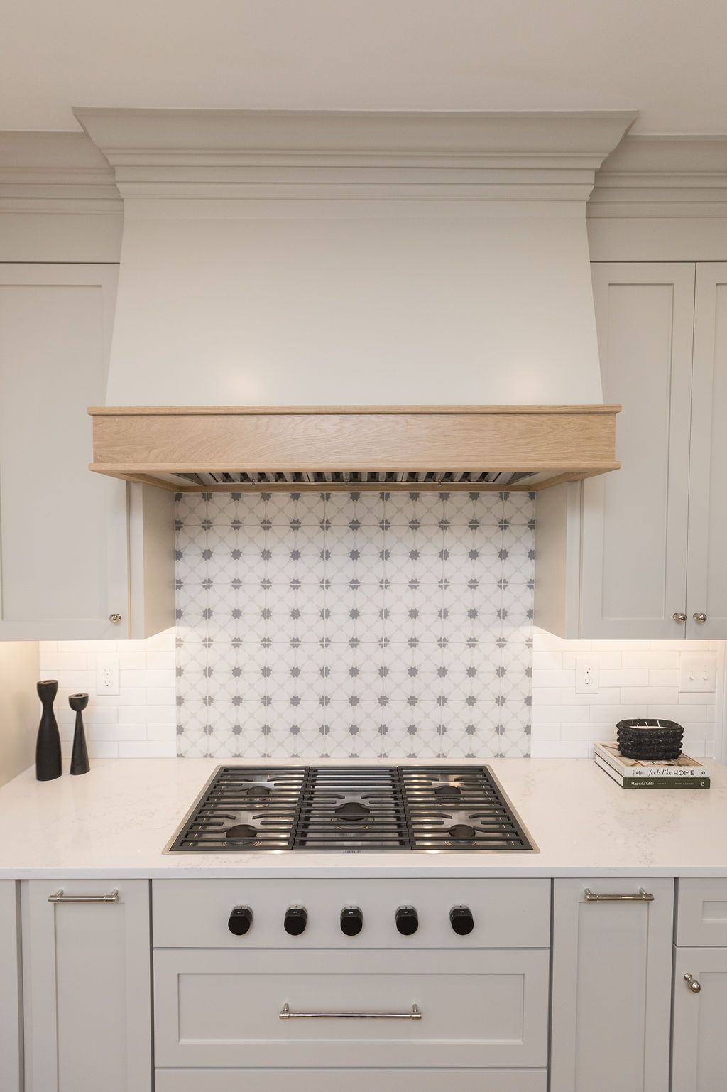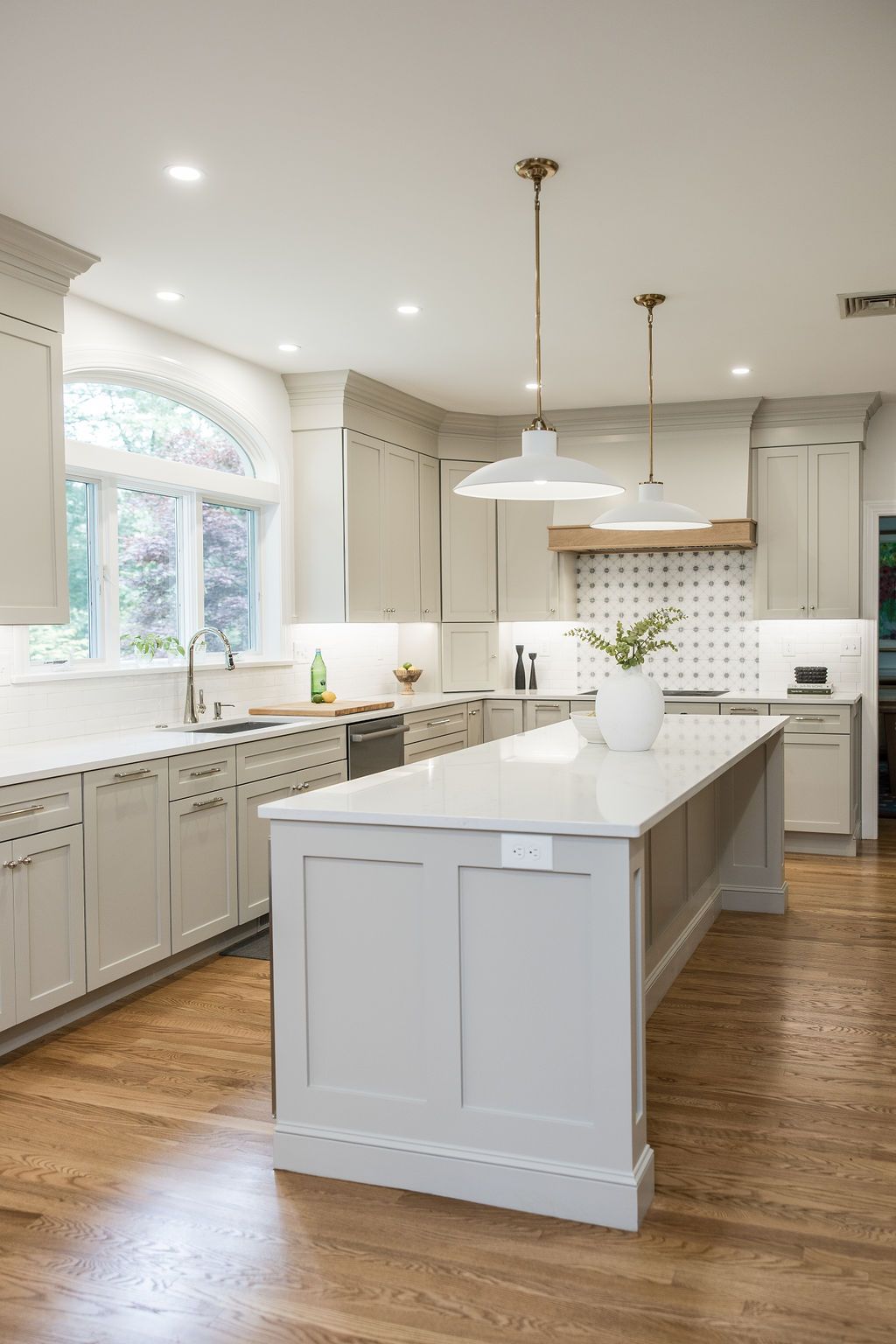 The organic cabinet color, white tile and countertops and the warmth of the wood on the stove hood paired beautifully and create a beautiful backdrop for design elements in the space. The warm cast of light from the undercabinet lighting and island pendants make it a dreamy space to work in.