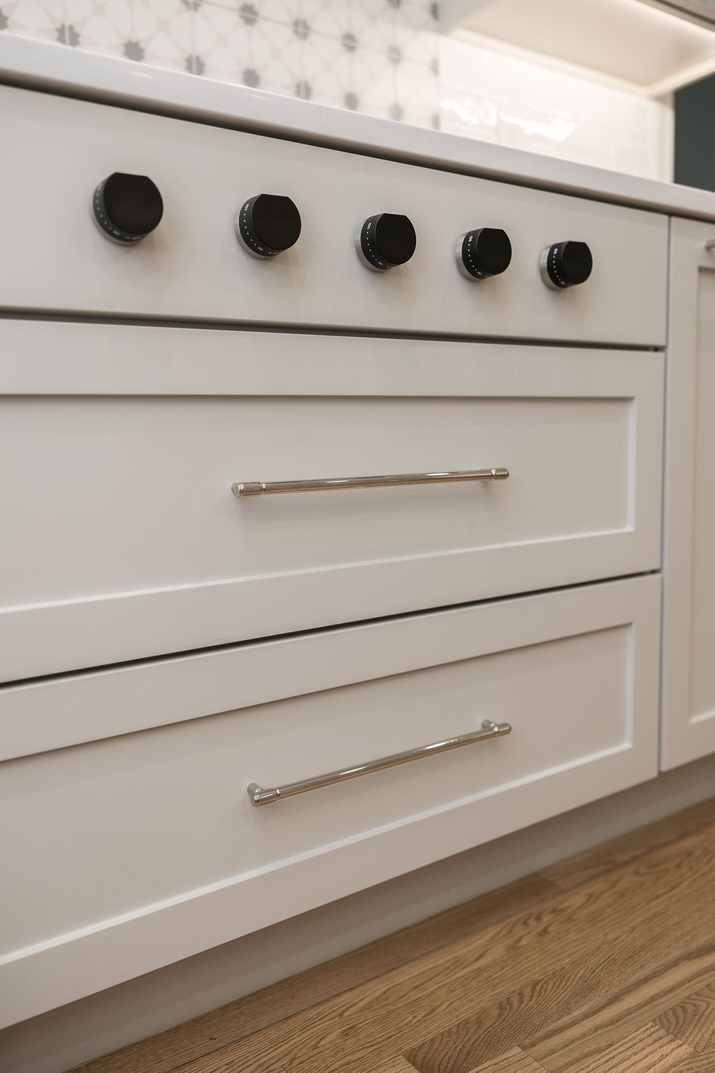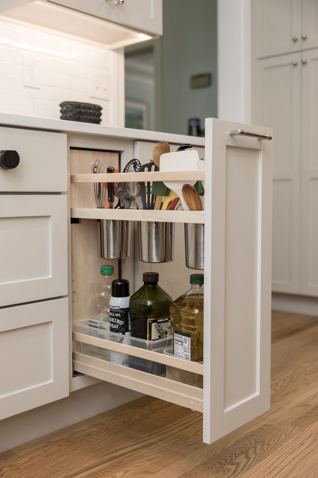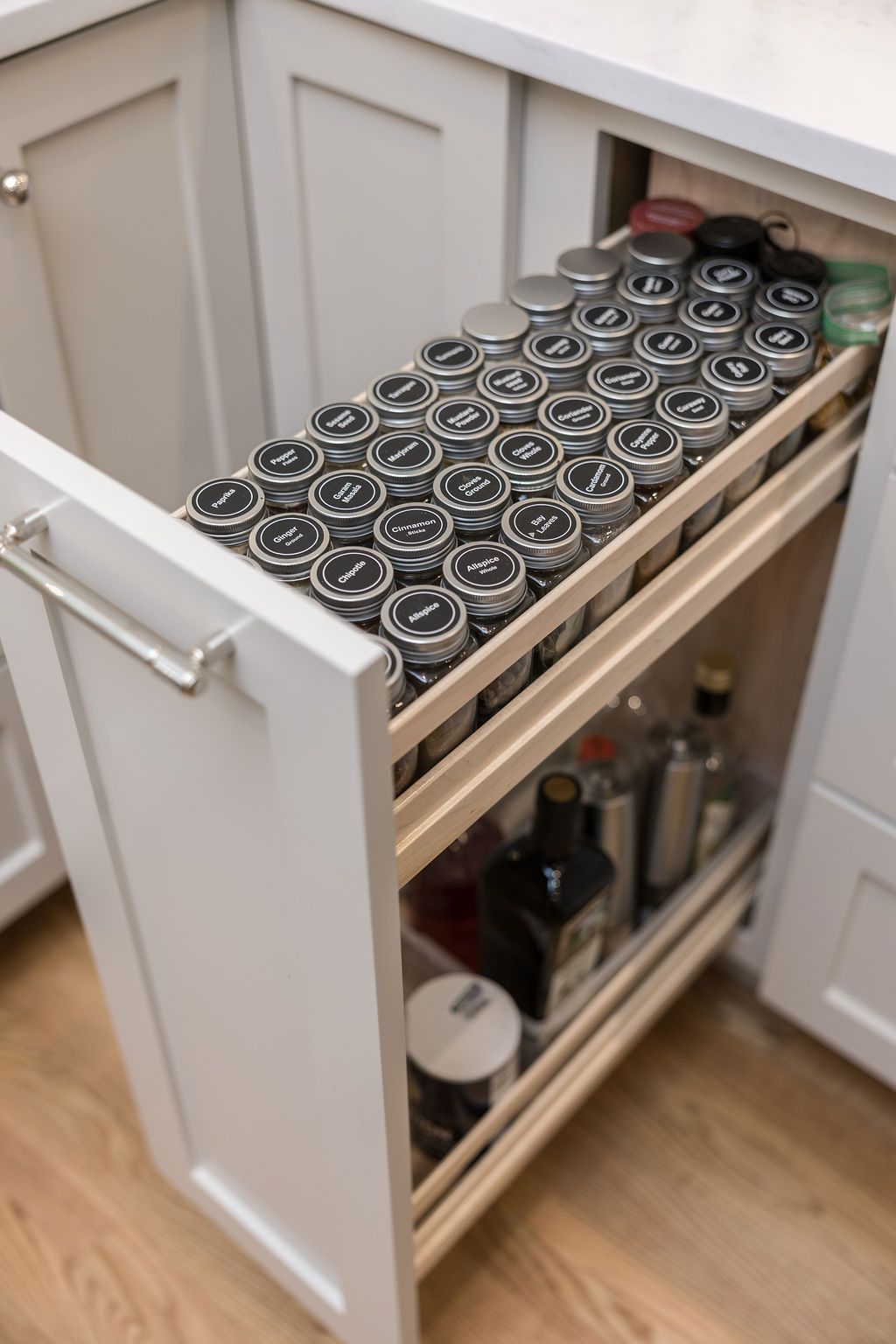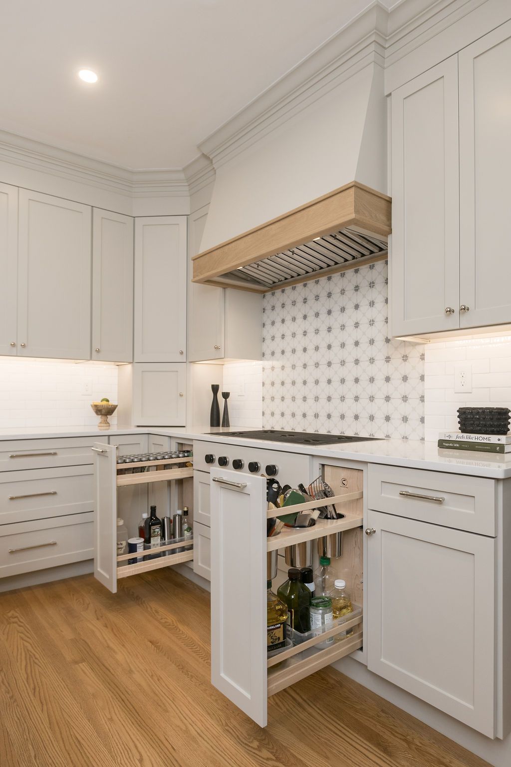 Surround the cooktop are two pull-outs keeping the necessary cooking instruments within an arm's distance. Carefully organized and labeled spice jars make the process that much easier.