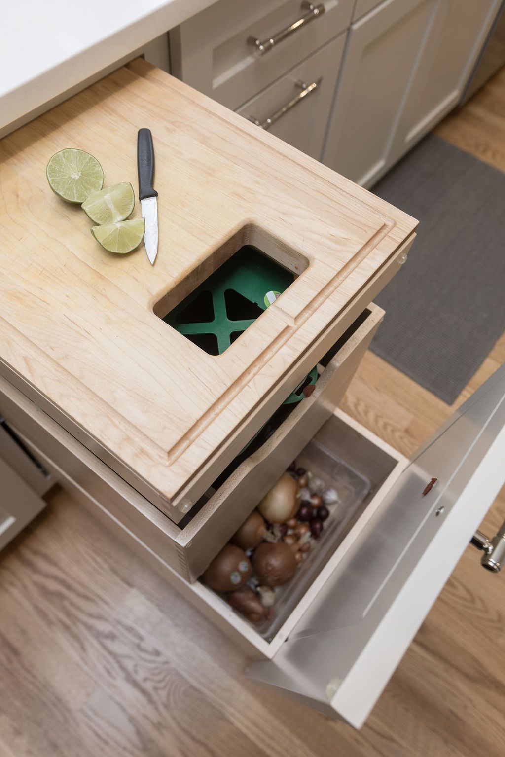The Hubley Team incorporated some custom made pieces into the space to fit the culinary needs of our client. The homeowners are diligent composters and wanted a receptacle incorporated in the kitchen to collect the food waste. A cutting board is strategically placed over the compost bin so food scraps can fall down into the bin. Below is a drawer for vegetable storage.
