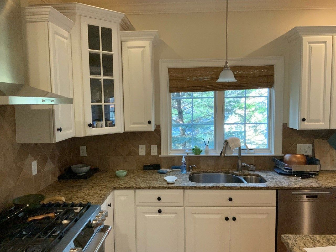 The painted cabinets and freshly painted walls lightened up the space. The new counters and white tile backsplash updated the kitchen giving it a clean and crisp feel. We love the Top Knobs hardware the homeowners selected for the doors and drawers tying in the sleek new Kohler faucet. Together these design changes transformed the kitchen making it feel like a brand new space.
