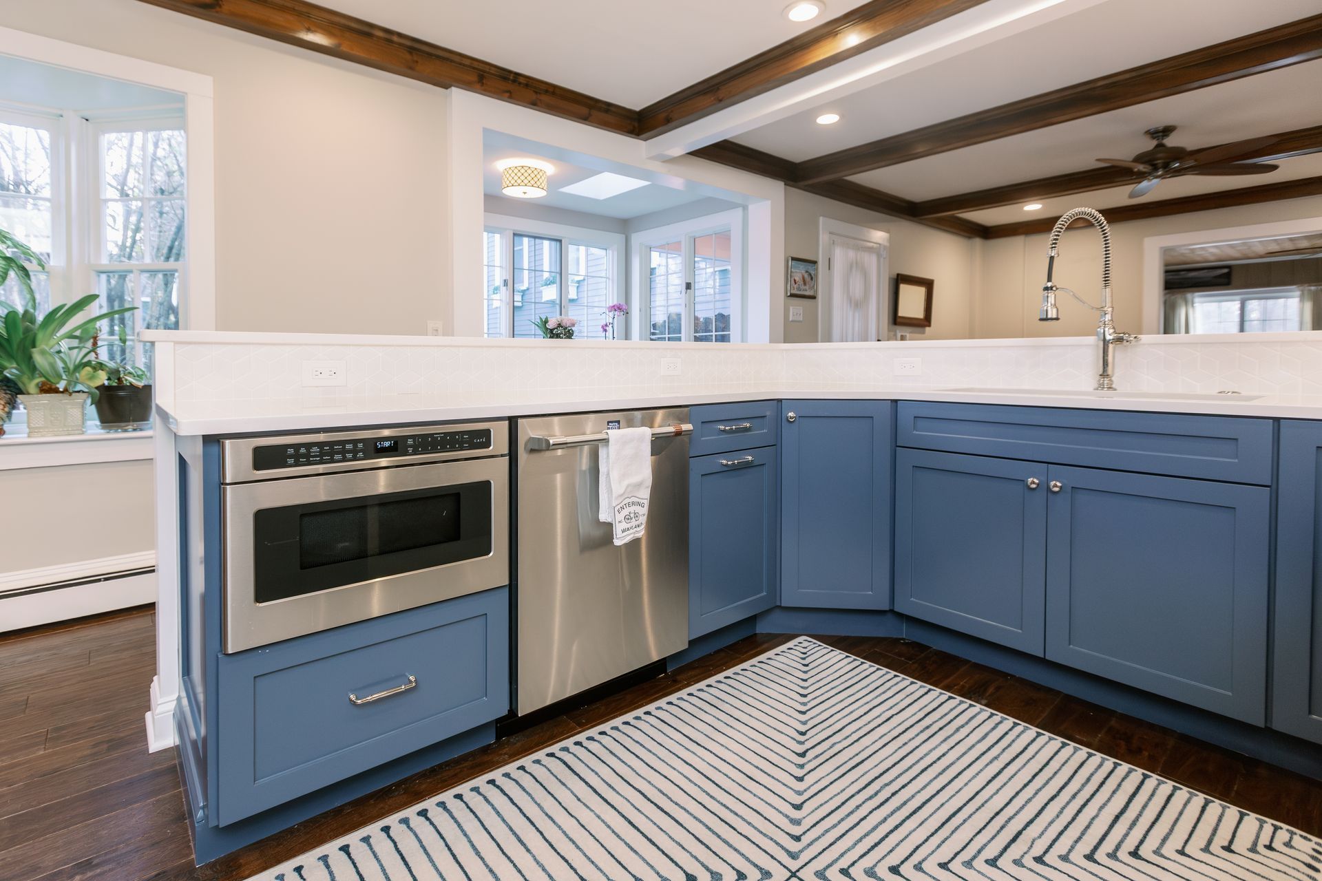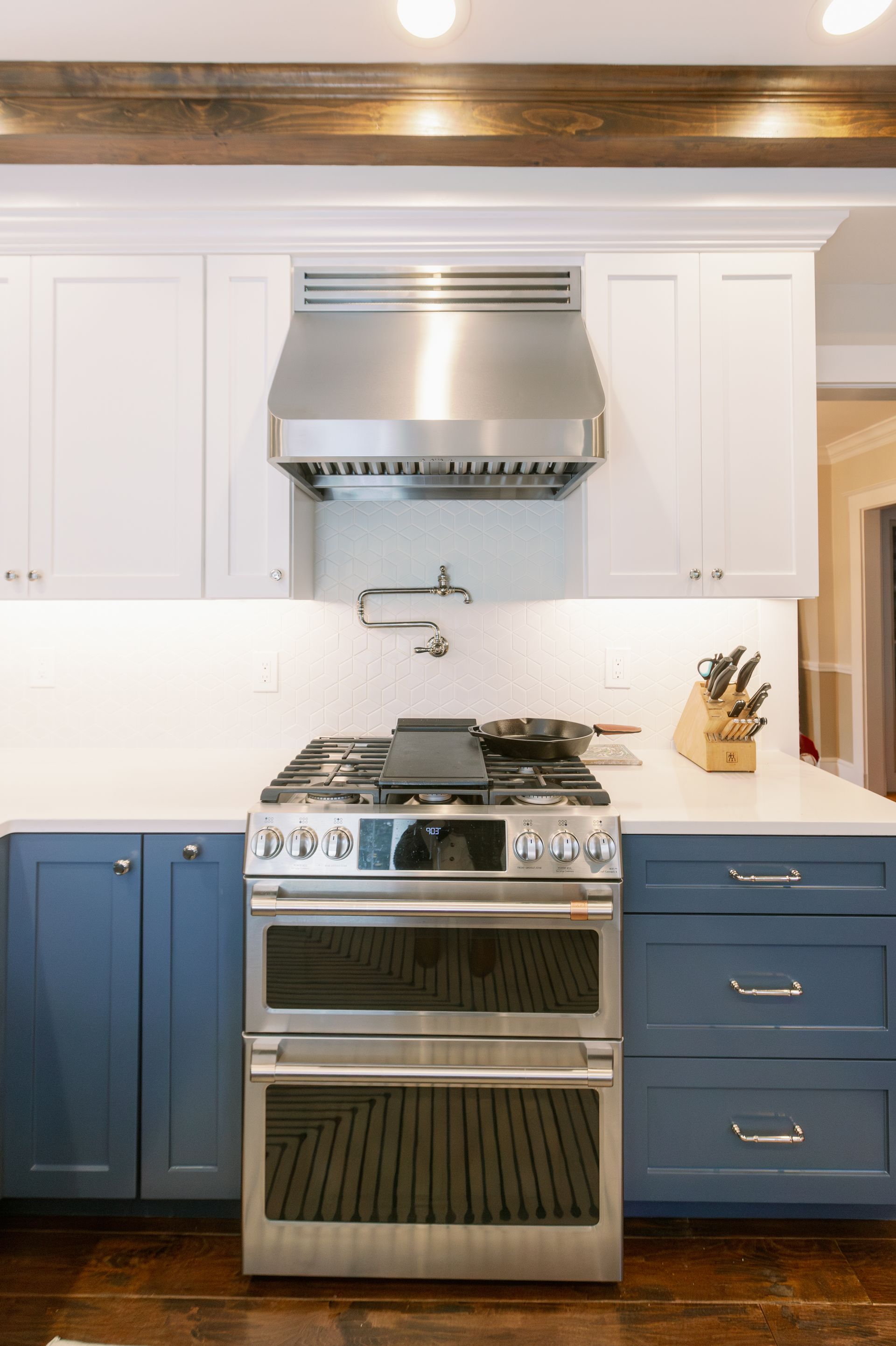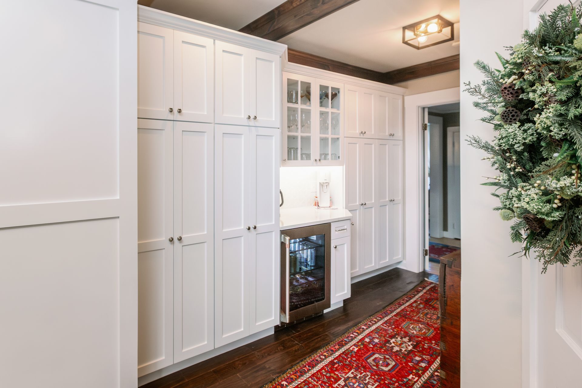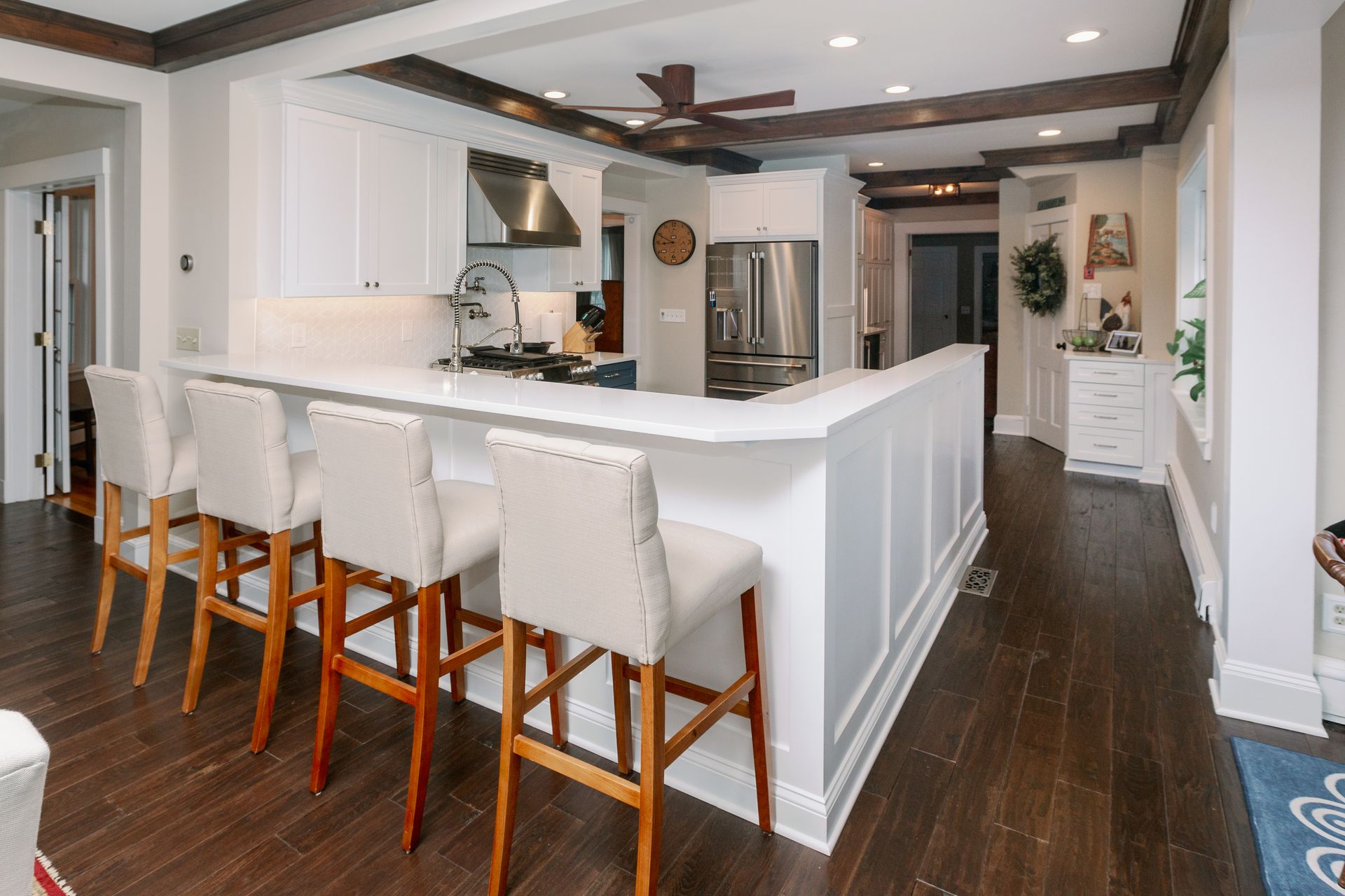 Our clients are the stewards of a beautiful home built in the late 1800s. They have worked hard to preserve the historical charm and character while blending in modern comforts. The homeowners were ready to update the kitchen with some more contemporary design details which made this space a perfect fit for the kitchen refresh program. The newly painted cabinets make the gorgeous wood beams a focal point in the space enhanced by the new countertops and tile backsplash.