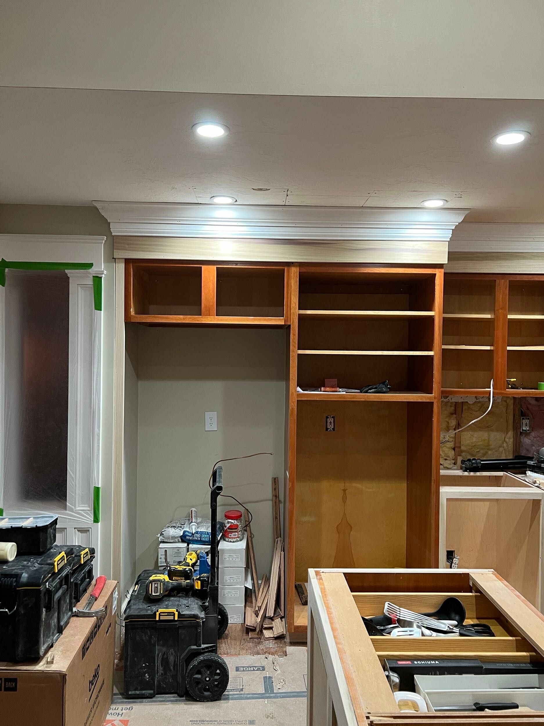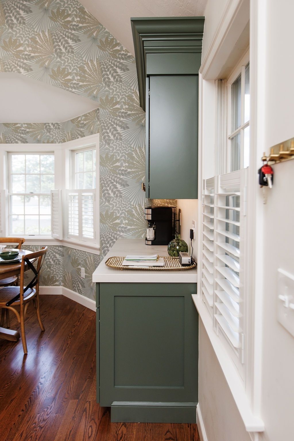 The small bank of green cabinetry is a mixture of old cabinet bases and new bases built to fill the unused wall space. The clients wanted this area to function as storage and a bar area so special drawers were built as requested to hold wine and liquor bottles.