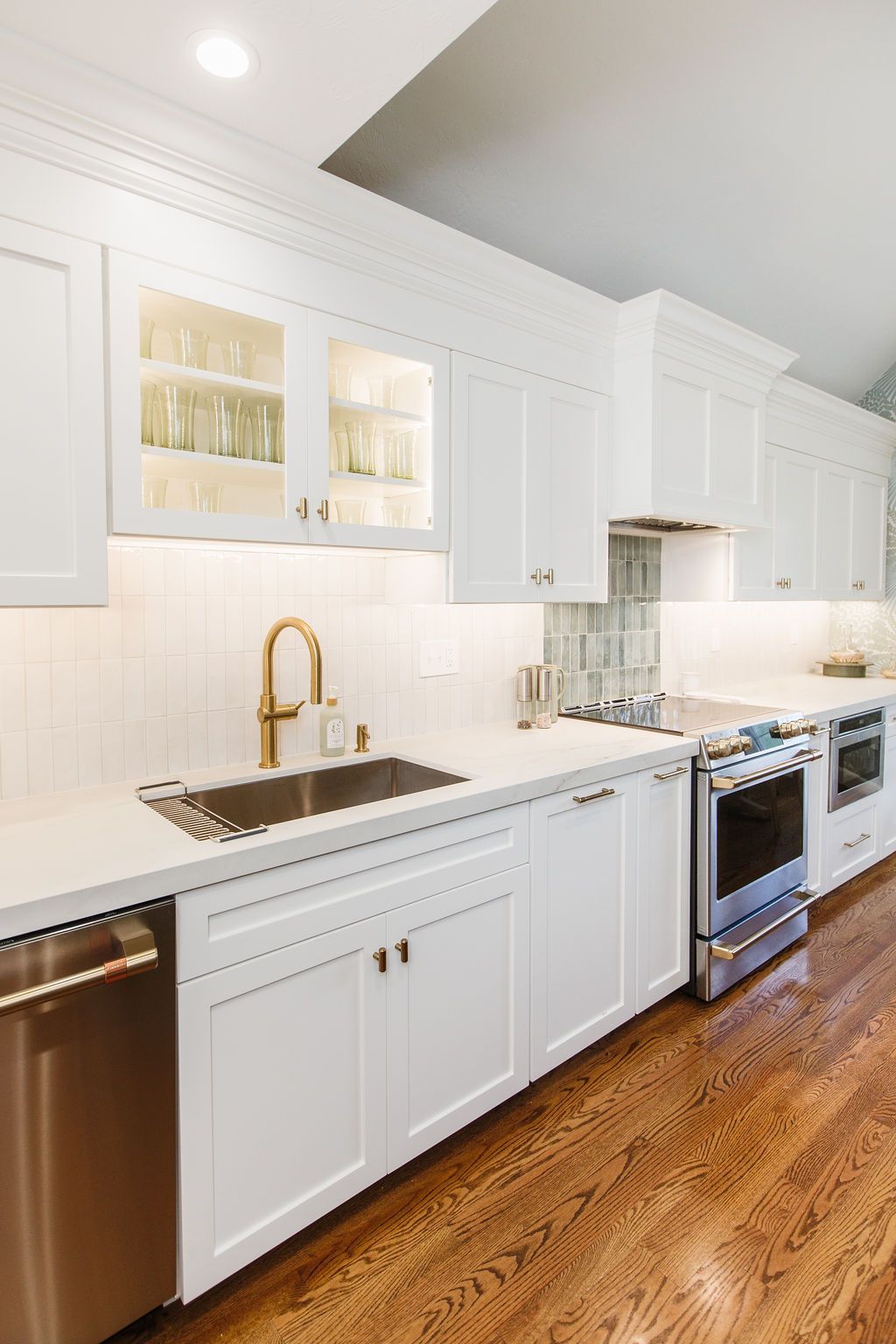 Moving the cooktop and stove to the longer wall of the kitchen makes it feel less cramped and provides ample work space to either side. A microwave drawer was built into the cabinetry adjacent to the stove. The green glass tile backsplash makes such a beautiful statement paired with the new stove hood.