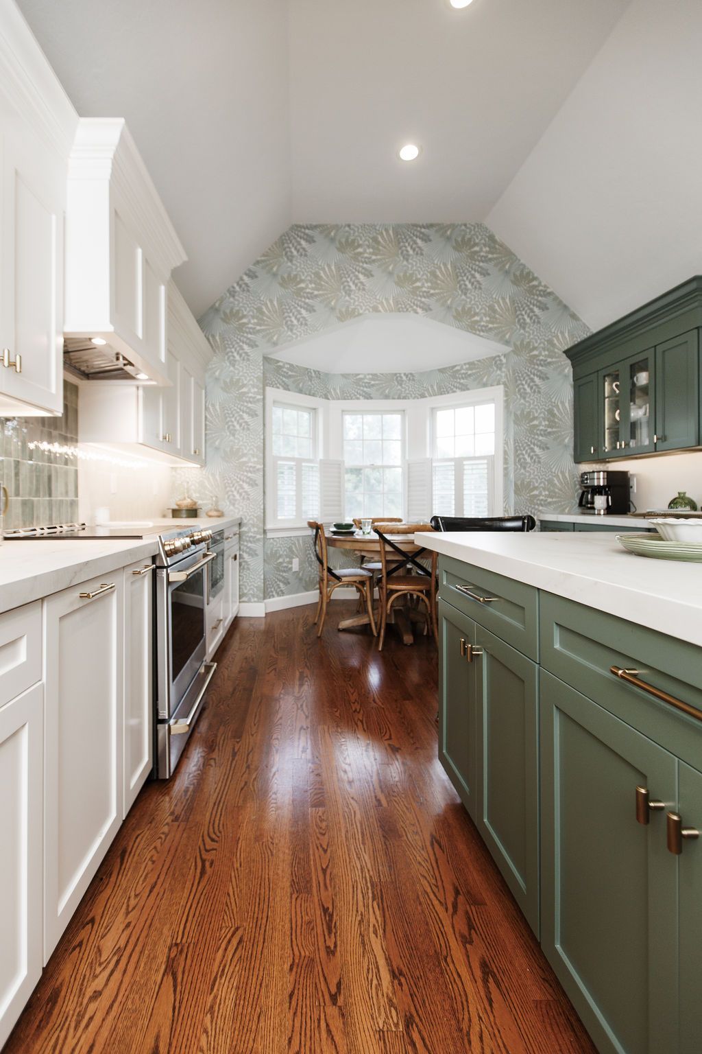 The green island does a beautiful job complimenting the wall paper. The Top Knobs brushed gold hardware pairs beautifully with the cabinet color. The counter over hang allows for seating on 2 sides of the island.